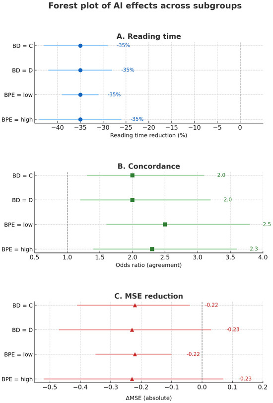 The fifth experimental step aimed to perform pre-specified subgroup and sensitivity analyses to evaluate the robustness and consistency of model performance and the impact of AI support across clinically relevant categories of breast density and background parenchymal enhancement. Subgroup analyses were performed for breast density (BD: C vs. D) and background parenchymal enhancement (BPE: low = minimal–mild vs. high = moderate–marked).