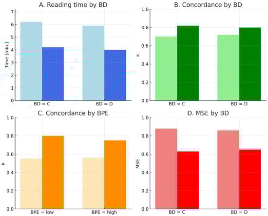 Stratum sizes were derived from the cohort distribution: BD C (38%) and BD D (21%) of the total n = 213 cases; BPE low (minimal–mild) accounted for 85% and BPE high (moderate–marked) for 15%. For outcomes measured per reading (e.g., reading time), counts were obtained by multiplying the number of cases by the five readers (e.g., BD-C ≈ 81 × 5 = 405 readings). For outcomes measured per case (e.g., MSE, κ), counts reflected the number of cases per stratum (e.g., BD-C ≈ 81).