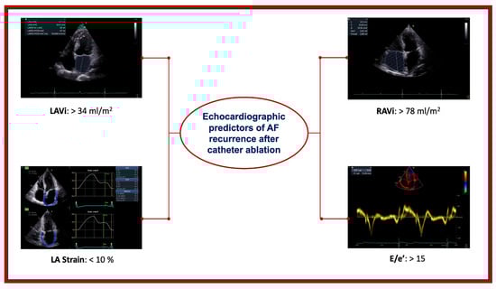 Atrial fibrillation (AF) is the most common arrhythmia in the population, with an estimated prevalence of 10% in patients above the age of 80 years [], which is expected to increase further due to improved clinical and diagnostic tools with beneficial effects on longevity and survival of older patients []. Many risk factors contribute to the occurrence of AF, which are either modifiable, such as hypertension, diabetes mellitus, smoking, generous alcohol intake, and excessive physical activity, or are nonmodifiable [,], including advanced age, which is a carrier of cardiac fibrotic process []. The diagnosis of AF is conventionally made by electrocardiography, but echocardiographic examination of such patients provides more details which could be useful in predicting its potential response to treatments (i.e., medical and/or electrical) as well as its recurrence []. Such information is the cornerstone of decision-making for either rhythm control or rate control []. The European society of cardiology (ESC) guidelines currently recommended the use of echocardiographic findings to stratify AF patients for either rate or rhythm control, in addition to catheter ablation (CA) procedure. Current guidelines specifically incorporate echocardiographic parameters in patient selection algorithms for AF ablation, with left atrial size and ventricular function being key determinants of procedural candidacy and expected outcomes []. CA therapy has been recommended for patients in whom antiarrhythmic medications fail to revert the rhythm back to sinus or fail to control the rate with its related symptoms. It is also recommended as a first line treatment to improve symptoms and quality of life (QoL) in selected patients including, new-onset fast AF, paroxysmal, persistent, or longstanding persistent AF according to the CABANA trial []. Despite the high AF ablation procedure success, approximately 35% of patients experience recurrence within 1 year. Several studies attribute such a high recurrence rate to genetic predisposition, obstructive sleep apnea syndrome (OSAS), hypertension, high body mass index (BMI), or reconnection of isolated pulmonary vein segments []. It is always the goal of the cardiologist to identify factors that predict the success of the AF ablation procedure and to stratify patients accordingly. Echocardiography may serve as a guide in this context, with an enlarged left atrium being the main predictor of AF relapse after CA. Advanced echocardiographic techniques, i.e., speckle tracking echocardiography (STE), have been proposed as having additional value in the better stratification of these patients. The aim of this review is to provide an overview on the importance of optimizing AF patients’ selection for CA, based on the current available evidence.