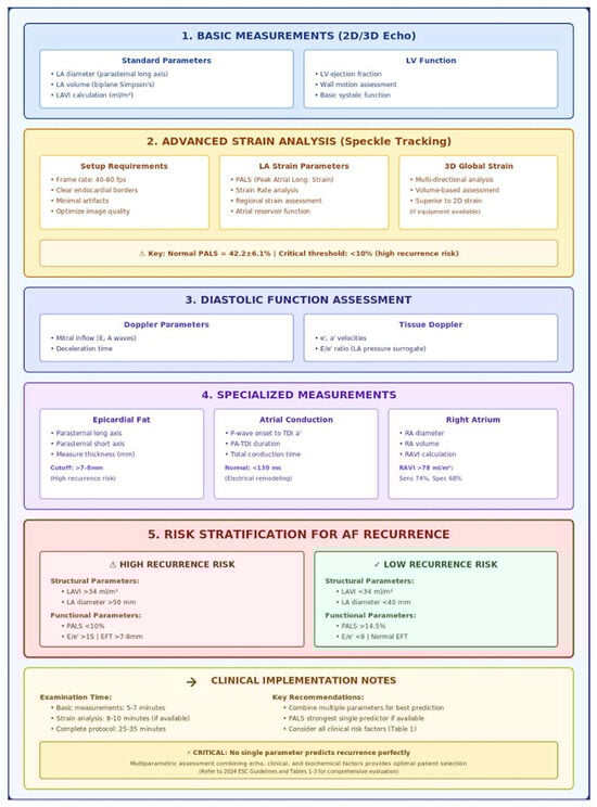 Epicardial fat thickness (EFT) has emerged as a separate and important echocardiographic risk factor for AF recurrence after catheter ablation []. Epicardial adipose tissue represents a metabolically active depot that directly surrounds the heart and coronary vessels. Increased EFT is associated with local inflammatory processes, oxidative stress, and the release of pro-arrhythmic cytokines that promote atrial fibrosis and electrical remodeling []. Studies have demonstrated that patients with increased EFT (typically >7–8 mm) show significantly higher rates of AF recurrence following ablation procedures []. The mechanism involves direct infiltration of inflammatory mediators from epicardial fat into adjacent myocardial tissue, promoting structural changes that facilitate arrhythmia persistence. EFT can be readily measured using transthoracic echocardiography and provides additional prognostic information beyond traditional parameters like left atrial size and function [].