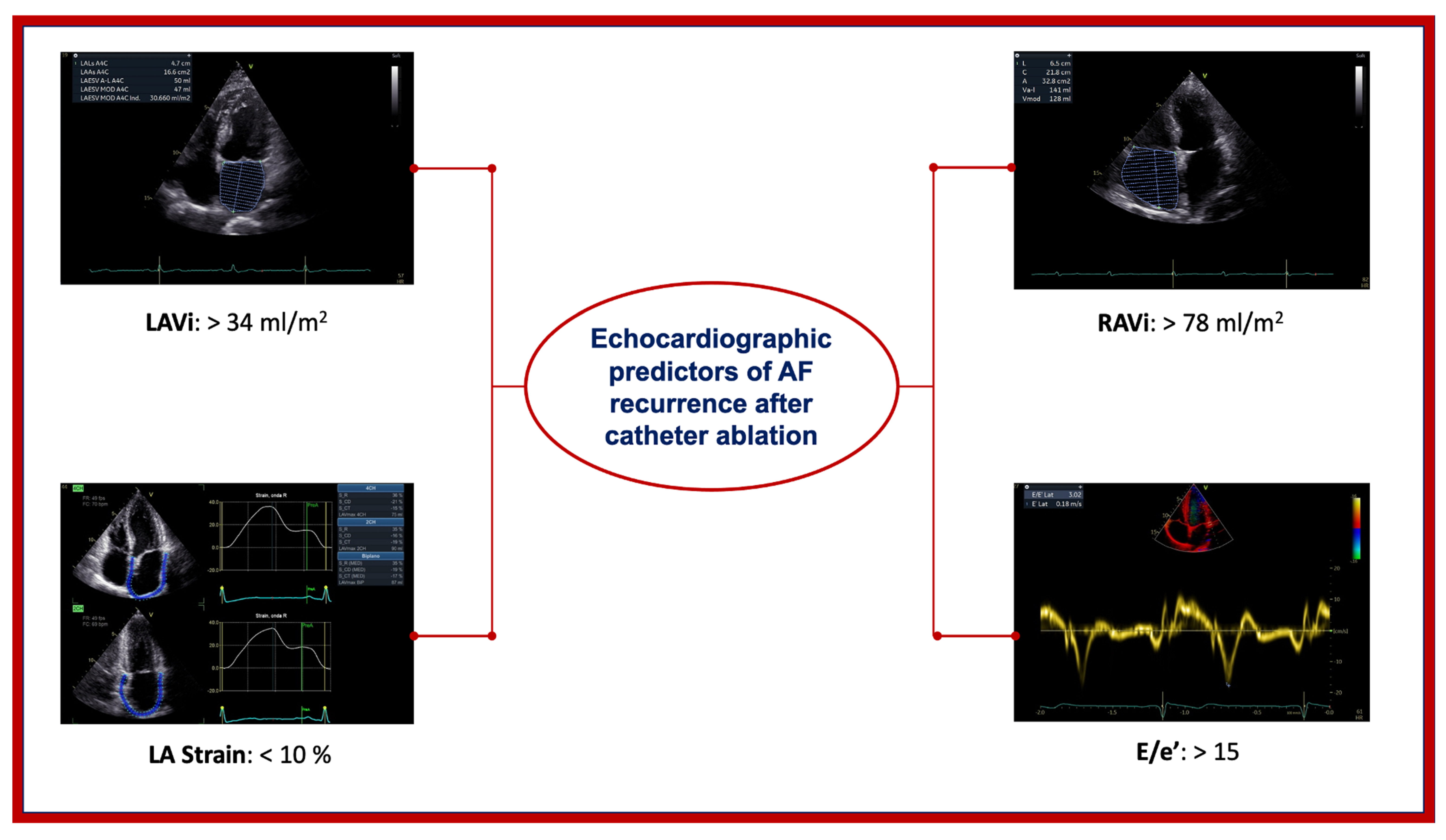 - Liżewska-Springer, A.; Dąbrowska-Kugacka, A.; Lewicka, E.; Drelich, Ł.; Królak, T.; Raczak, G. Echocardiographic predictors of atrial fibrillation recurrence after catheter ablation: A literature review. Cardiol. J. 2020, 27, 848–856. [Google Scholar] [CrossRef] [PubMed] [PubMed Central]