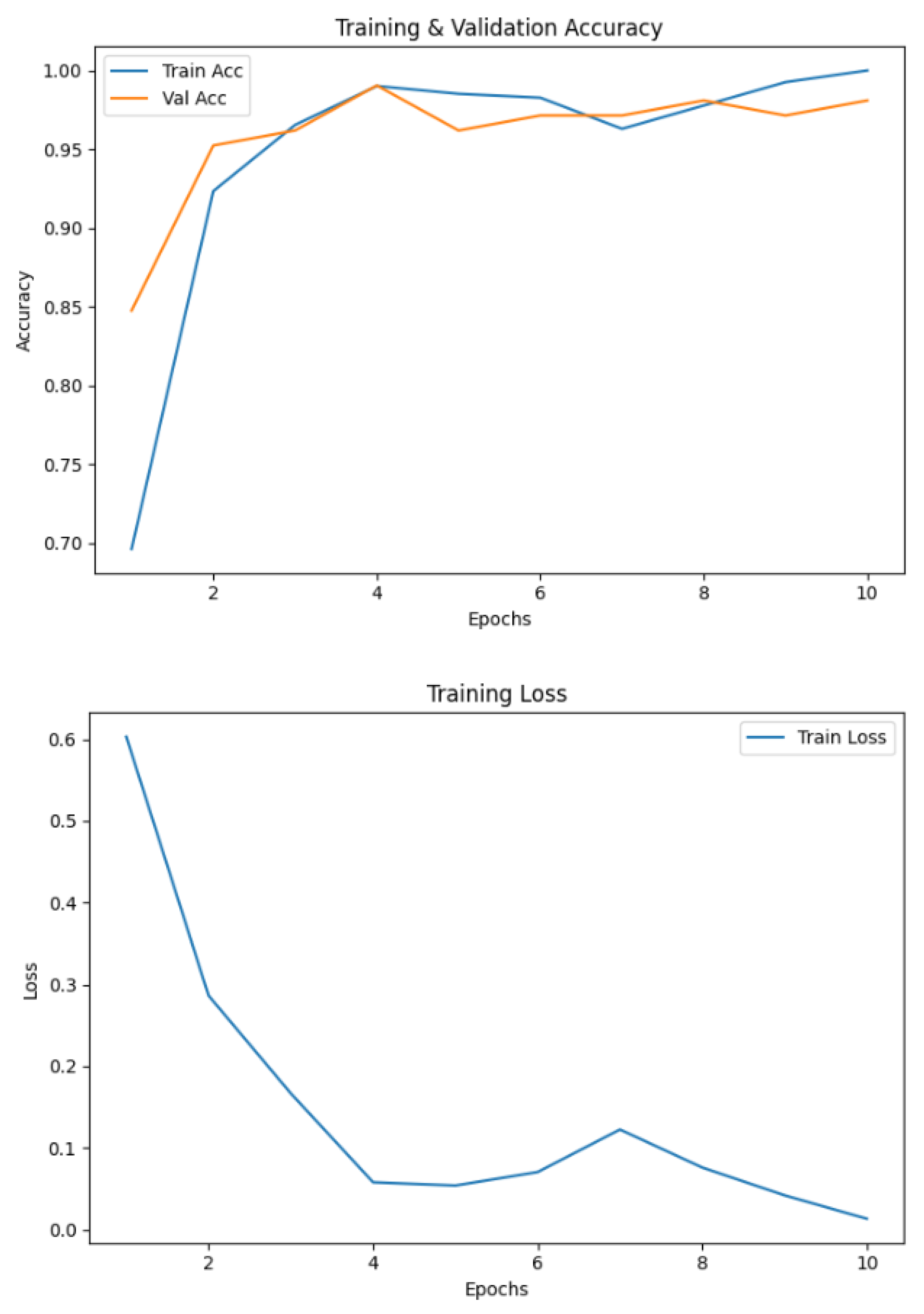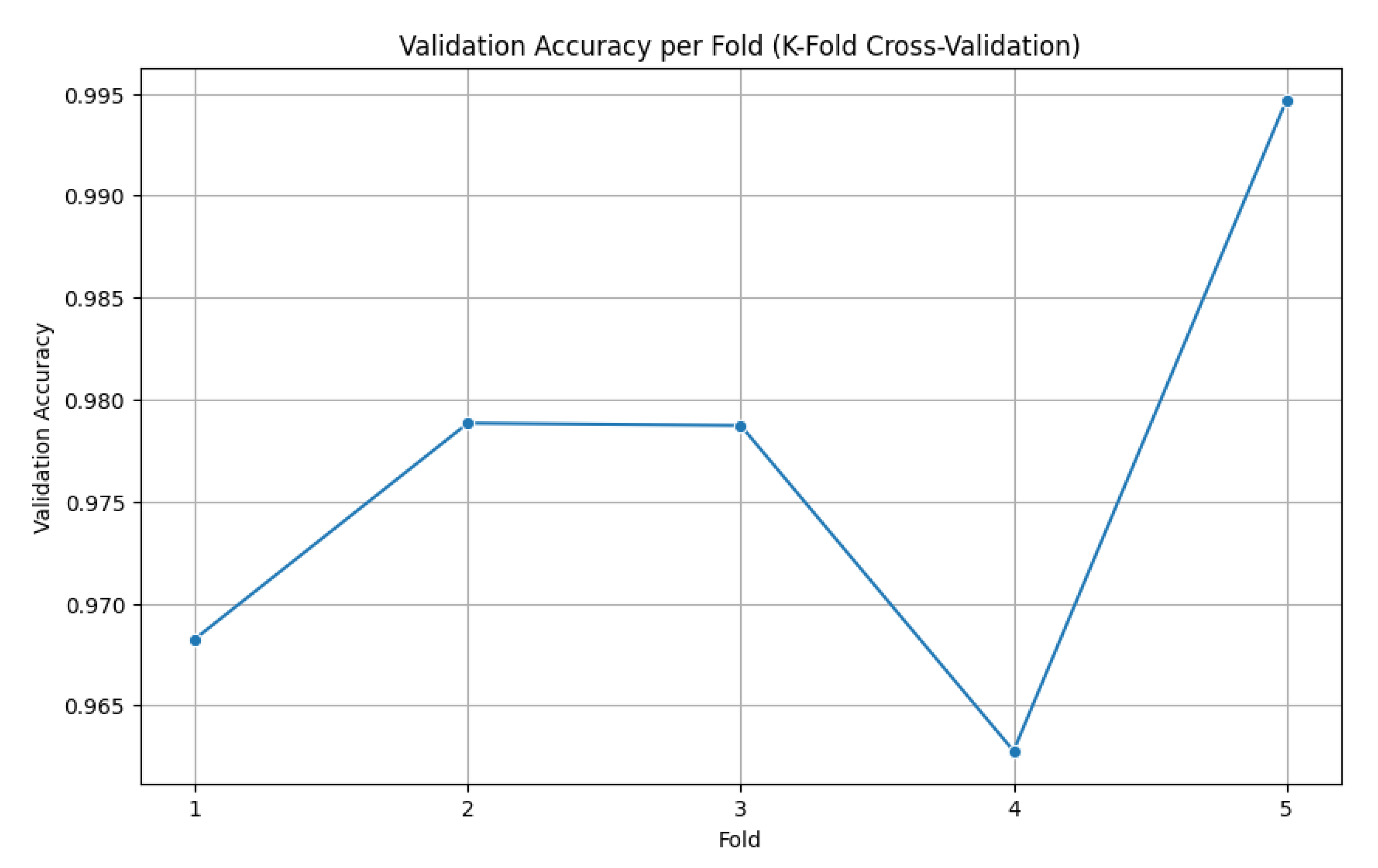 The model demonstrated consistently high validation accuracy across all folds, ranging from 96.28% to 99.47%, reflecting its strong ability to generalize. Fold 4 showed the weakest performance, with a slightly higher validation loss (0.0968) and lower accuracy (96.28%), indicating some variability in that subset of data. In contrast, Fold 5 achieved the best results, delivering a near-perfect accuracy of 99.47% and the lowest validation loss (0.0342), highlighting excellent discriminative capability. Overall, the validation losses remained low across all folds, underscoring the model’s stability and robustness.