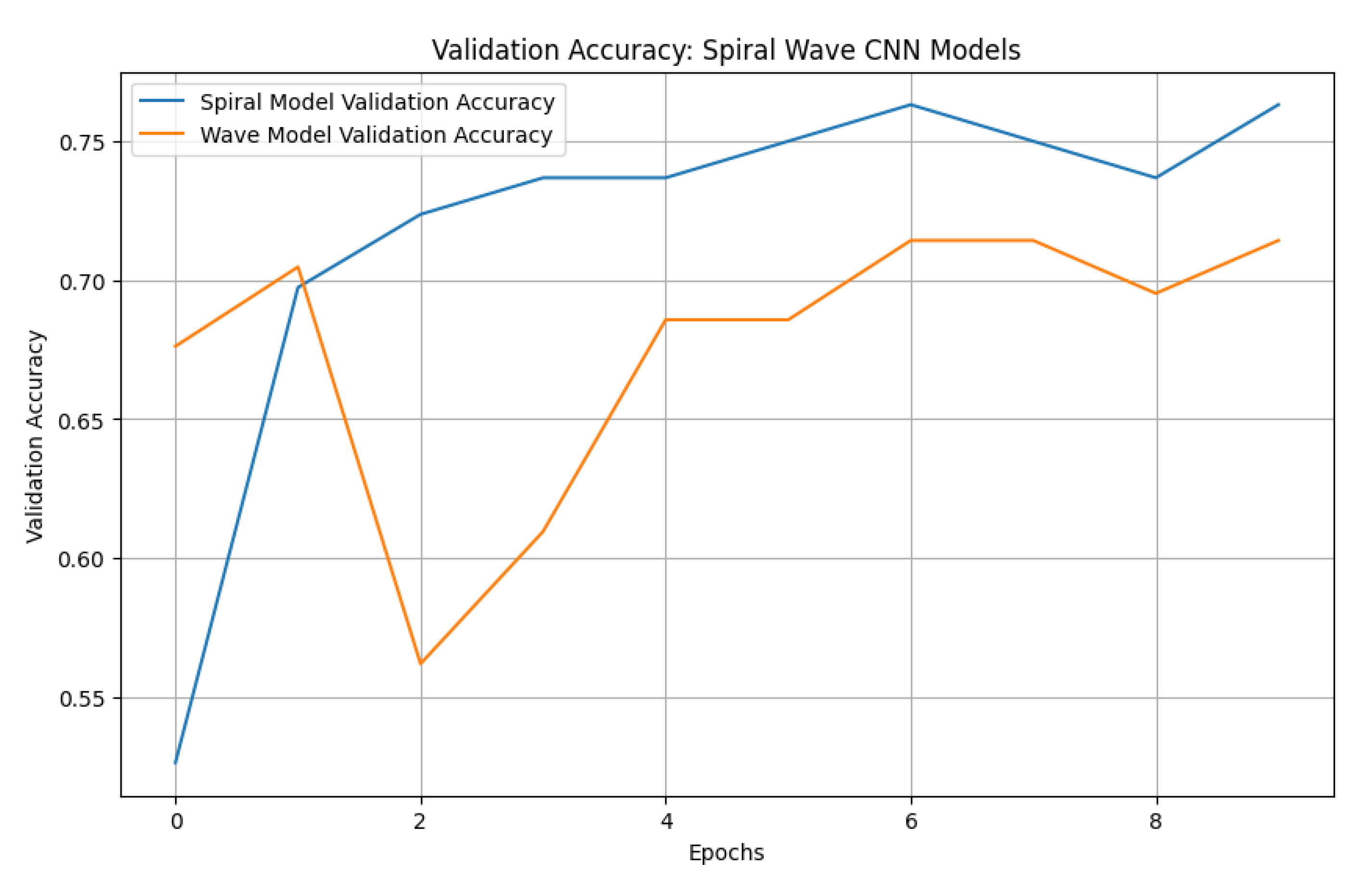 To establish a benchmark, a standard CNN was trained using the same preprocessed spiral and wave handwriting datasets. The CNN achieved validation accuracies of 0.7143 on wave images and 0.7632 on spiral images, as shown in