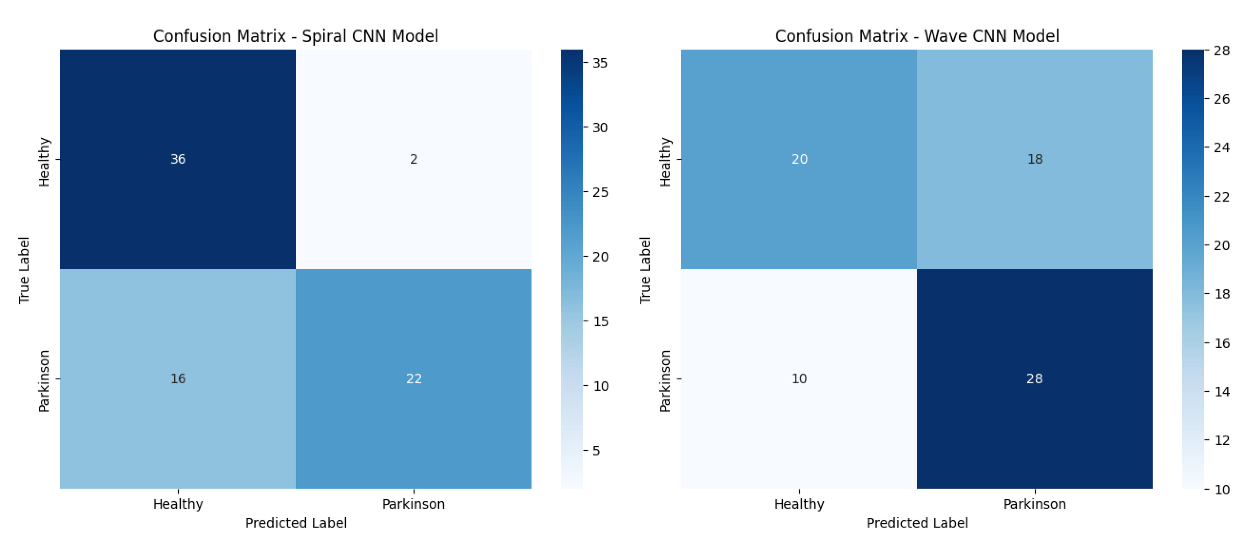 Figure 11 presents confusion matrices of the baseline CNN model on both the spiral and wave datasets, highlighting class-wise prediction strengths and misclassifications.