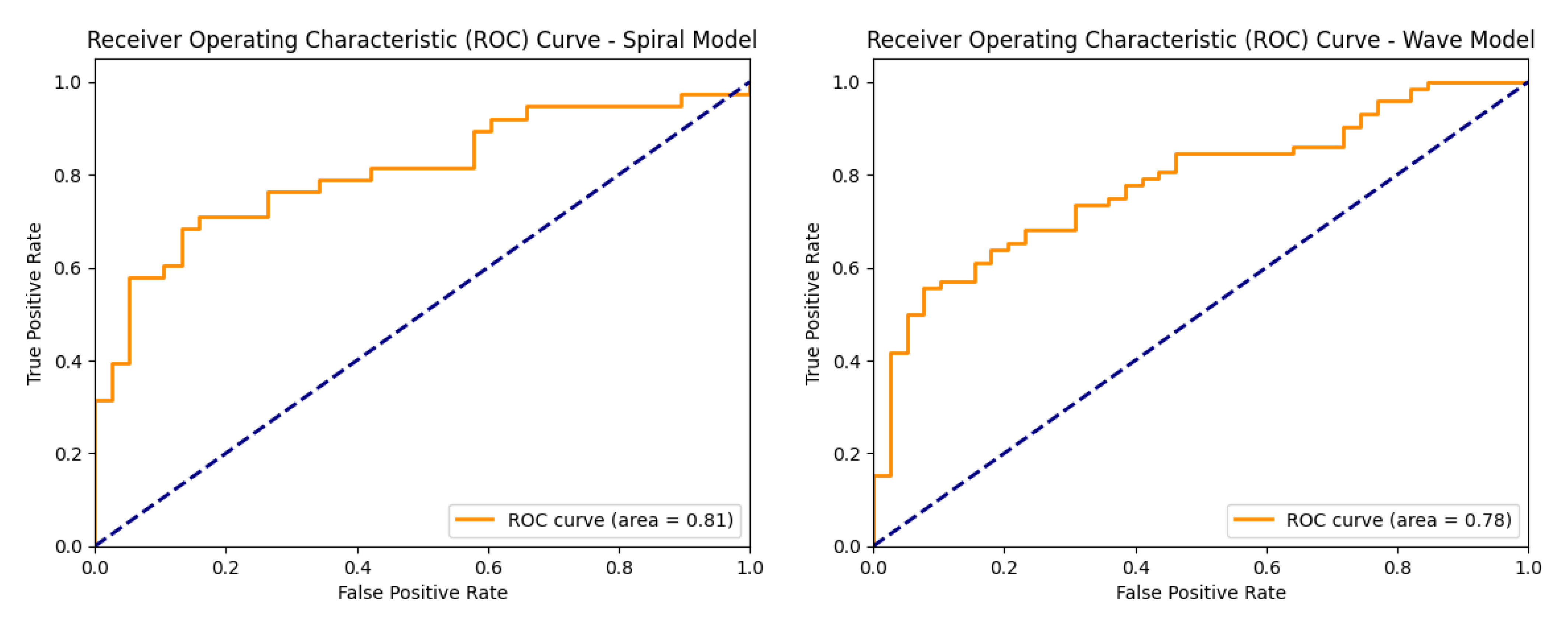 Figure 12 shows the ROC curves of the baseline CNN model, illustrating its ability to distinguish between healthy and Parkinson’s classes on both the spiral and wave datasets.