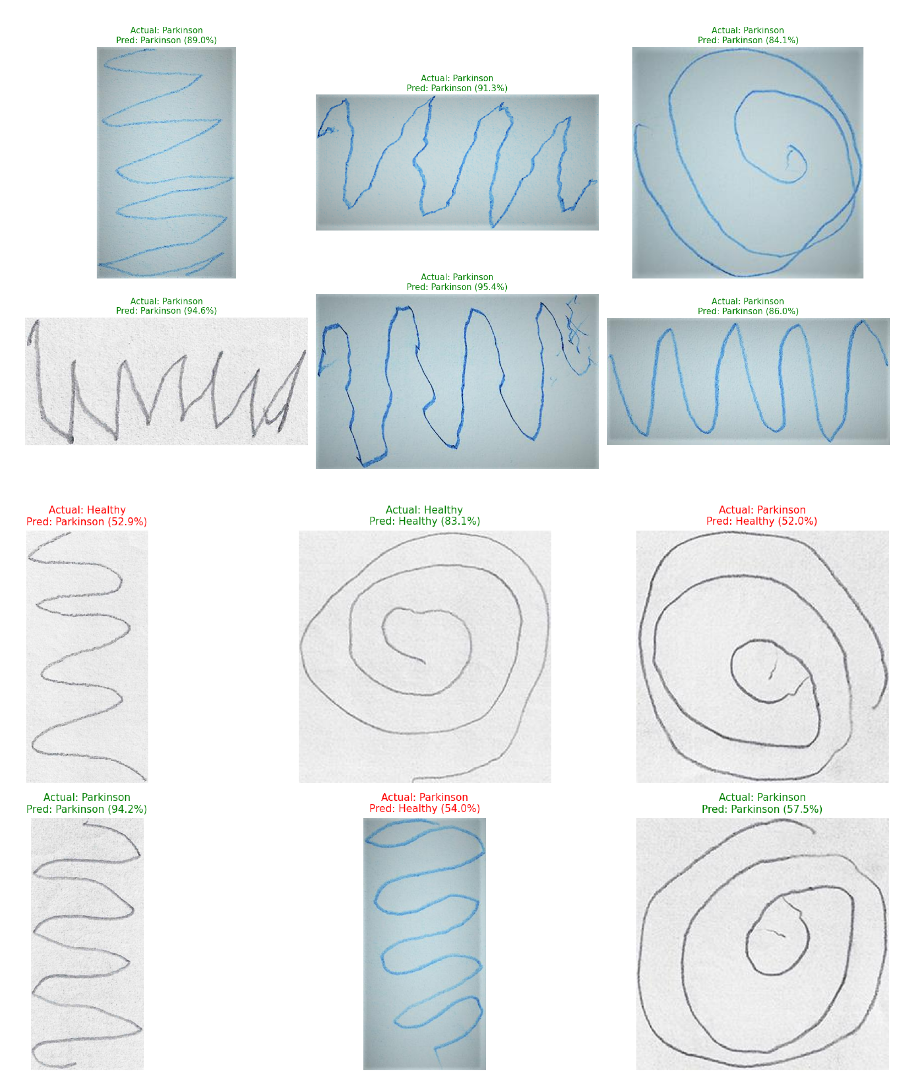 Individually, the models trained on spiral and wave inputs achieved strong accuracies of 98.68% and 98.10%, respectively. However, when both modalities were fused, a mean validation accuracy of 0.9767 ± 0.0109 was achieved across five folds. These results suggest that spiral drawings capture tremor-induced distortions and curvature irregularities, while wave patterns exhibit motor rhythm and smoothness. Together, they create a richer representation of motor function. The fine-tuning of EfficientNetV2-S on handwriting data yielded higher accuracy and robustness compared to conventional CNNs and handcrafted feature-based approaches. Experimental evidence supports this claim. EfficientNetV2-S consistently delivered high accuracy across folds. Its fused MBConv blocks, SiLU activation, and progressive learning strategy effectively leveraged limited handwriting data while maintaining computational efficiency, making it well-suited for clinical and real-world applications.