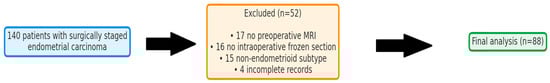 Exclusion criteria included absence of preoperative MRI, lack of intraoperative frozen section analysis, and incomplete medical records. In cases where sentinel lymph node mapping was successfully performed, intraoperative frozen section analysis was not conducted; therefore, these patients were also excluded from the study. Non-endometrioid histologic subtypes were excluded to maintain homogeneity, as they demonstrate distinct biological behavior and prognostic profiles.
