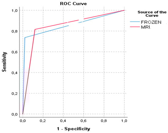 Receiver operating characteristic (ROC) curves comparing the diagnostic performance of MRI and intraoperative frozen section in detecting myometrial invasion.