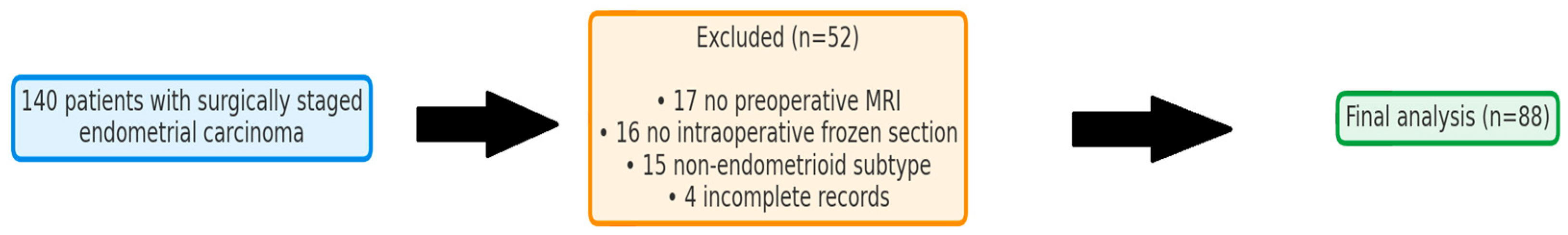 - Jónsdóttir, B.; Marcickiewicz, J.; Borgfeldt, C.; Bjurberg, M.; Dahm-Kähler, P.; Flöter-Rådestad, A.; Hellman, K.; Holmberg, E.; Kjølhede, P.; Rosenberg, P.; et al. Preoperative and intraoperative assessment of myometrial invasion in endometrial cancer-A Swedish Gynecologic Cancer Group (SweGCG) study. Acta Obs. Gynecol. Scand. 2021, 100, 1526–1533. [Google Scholar] [CrossRef]