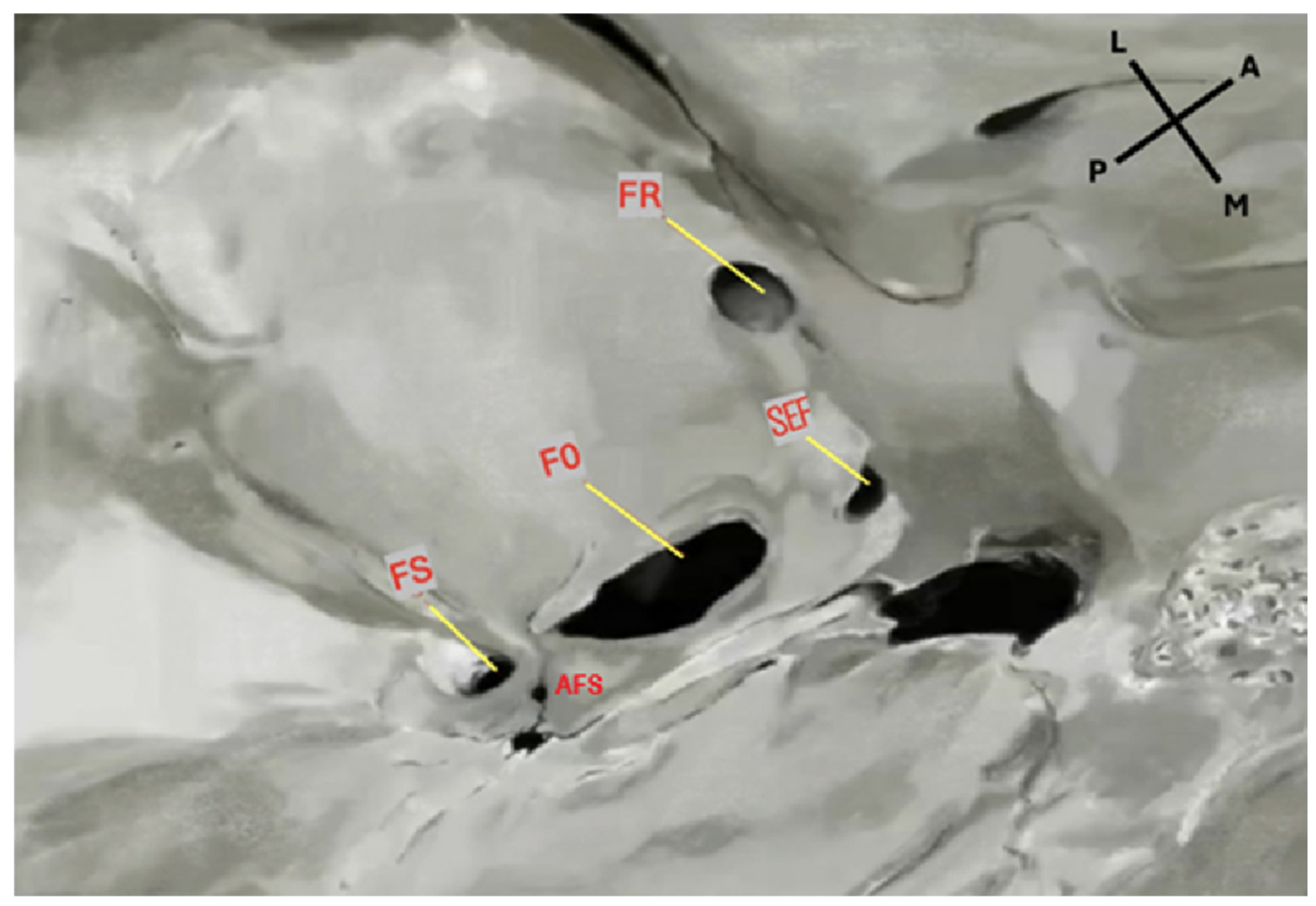 The sphenoidal emissary foramen (SEF)—also known as the foramen Vesalii or foramen venosum—is an inconstant and highly variable foramen situated in the greater sphenoidal wing within the MCF (Figure 1 and Figure 2). It is usually positioned anteromedially to the FO and FS, and posteromedially to the foramen rotundum (FR). Its extracranial aperture opens into the scaphoid fossa, located within the pterygoid process [6,7]. SEF may occur unilaterally or bilaterally and, although rare, may appear duplicated. When it forms a complete canal across the cranial base and remains patent, it becomes clinically significant, as it may transmit a venous channel between the pterygoid venous plexus and the cavernous sinus (CS).