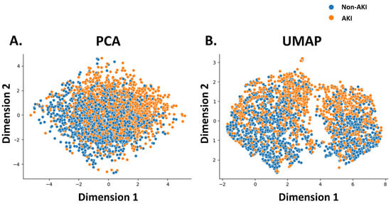 PCA and UMAP were used to reduce the dimensions of all the features mentioned above to visualize their correlations with AKI. Both PCA and UMAP showed that these features roughly distributed patients with AKI to the right upper dimension and non-AKI patients to the left lower dimension (Figure 1). The substantial overlap between the orange and blue clusters in both plots visually demonstrates the inherent difficulty in diagnosing AKI using point-of-care data. There is no simple, clear boundary that separates the two patient populations. This complexity underscores the limitations of simple diagnostic rules and provides the rationale for using machine learning models, which are designed to identify subtle, non-linear patterns within such complex data. The rough distribution, where AKI patients (orange) show some tendency to cluster, suggests that such patterns exist for a model to learn.