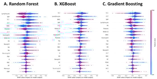 Feature importance of the three best performing machine learning models. This figure displays the most important clinical features for the three top-performing machine learning models, as determined by SHAP values. (A) Random Forest Model. (B) XGBoost Model. (C) Gradient Boosting Model. Feature Ranking (Y-axis): Clinical features are ranked from top to bottom based on their overall impact on the model’s predictions. Higher-ranked features are more influential. Impact on Diagnosis (X-axis): Each dot represents a single patient. A dot’s position on the horizontal axis shows how that feature value influenced the model’s conclusion for that patient. Dots on the right side (positive SHAP values) pushed the prediction towards an AKI diagnosis, while dots on the left side (negative SHAP values) pushed the prediction towards a non-AKI diagnosis. Feature Value (Color): The color of each dot indicates the feature’s value for that patient. Red dots represent higher clinical values (e.g., high serum creatinine), and blue dots represent lower values. SHAP value, SHapley Additive exPlanations; XGBoost, Extreme Gradient Boosting.