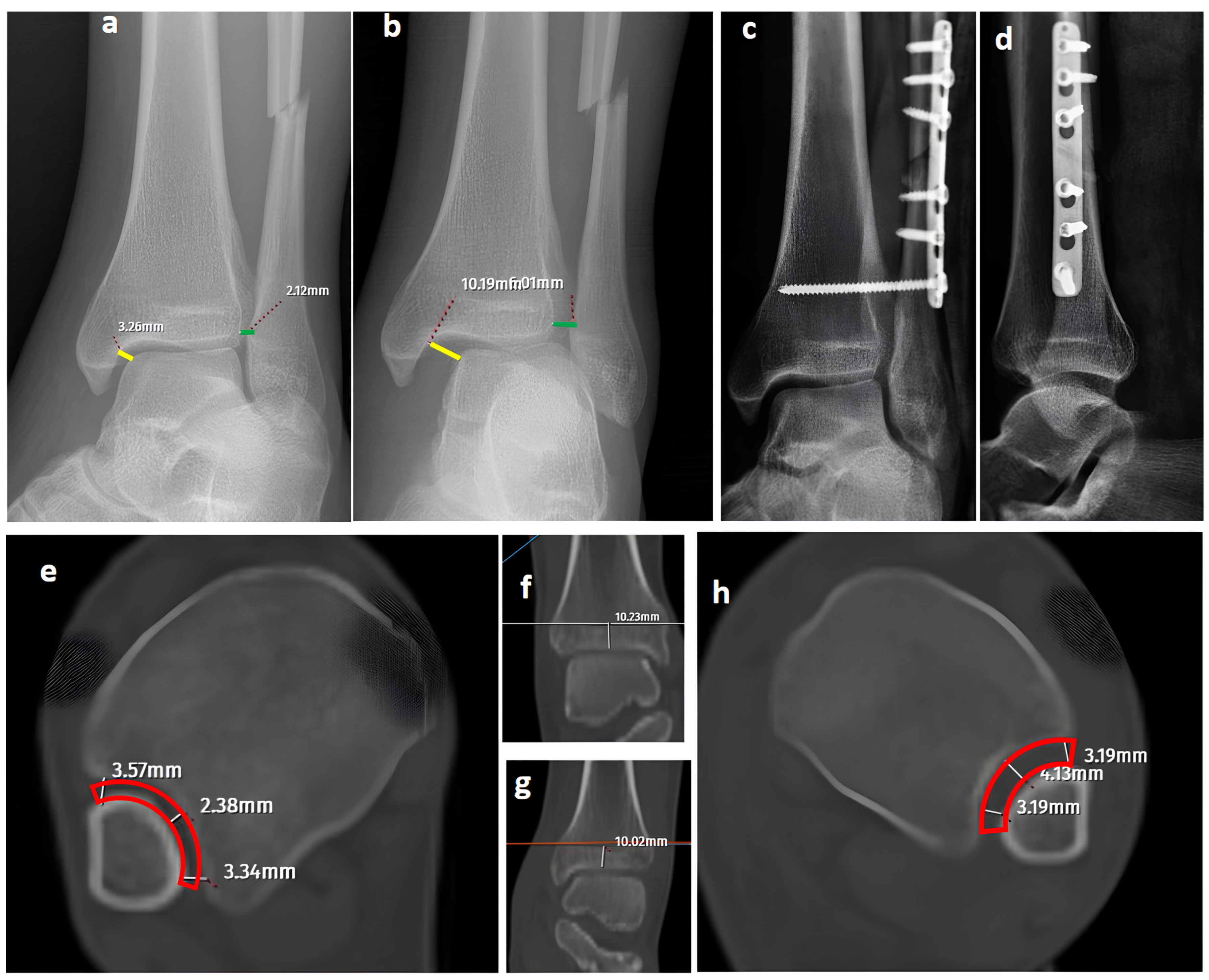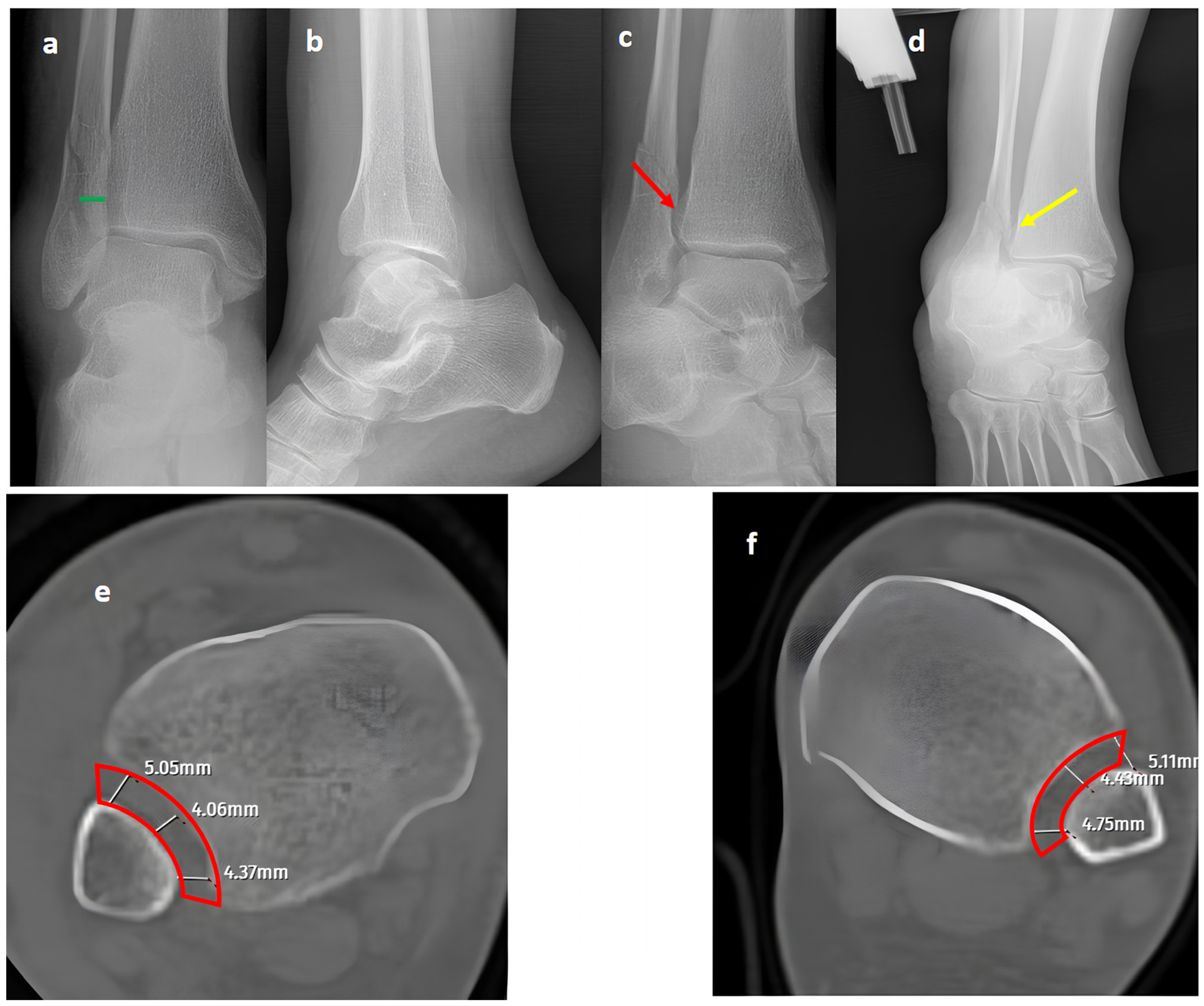 The study included patients aged 16 years or older with a unilateral ankle fracture and the necessary medical records needed, including appropriate X-rays, bilateral ankle CT images, and at least 6 months of follow-up data. Patients who underwent either surgical intervention or conservative treatment were included in the study group, as in most cases of ankle or malleolar fractures; the presence of a syndesmosis injury was the critical determinant guiding the decision between operative and nonoperative management. In surgically treated patients, syndesmosis injuries are more often apparent, requiring less additional imaging, whereas in conservatively managed patients, less severe injuries may create diagnostic uncertainty. Therefore, the inclusion of patients who underwent conservative treatment was essential to ensure a comprehensive evaluation of the entire patient population. Patients were excluded from the study if they lacked adequate medical records, had pathological or open fractures, any additional cruris injuries, congenital lower extremity pathologies, new or previous injuries in the same extremity, a history of prior ankle surgery, or had not completed at least 6 months of follow-up.
