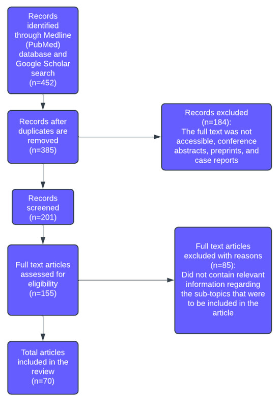 A total of 452 records were initially identified. After removal of duplicates, 385 records remained. Following title and abstract screening, 184 records were excluded. Of the 155 full-text articles assessed for eligibility, 85 were excluded for not meeting the inclusion criteria. A total of 70 articles were included in the final review. The article selection process is summarised in Figure 1.