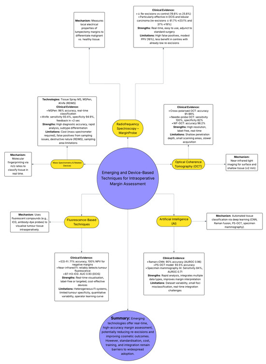 Overview of emerging and device-based intraoperative margin assessment techniques, including radiofrequency spectroscopy, optical coherence tomography, fluorescence imaging, mass spectrometry-based tools, and artificial intelligence. Each method’s mechanism, key evidence, strengths, and limitations are summarised, highlighting their potential to improve real-time margin evaluation and reduce re-excision rates.