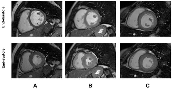 The control group consisted of 167 healthy individuals (54.5% females, mean age 36.32 ± 15.78 years) recruited from a multicenter cohort established to determine reference values for cardiac functional parameters and myocardial T1 values []. Control subjects were eligible if they had a normal resting electrocardiogram, no history or clinical evidence of cardiovascular disease, no conventional cardiovascular risk factors or systemic disorders, and no absolute contraindications to MRI.