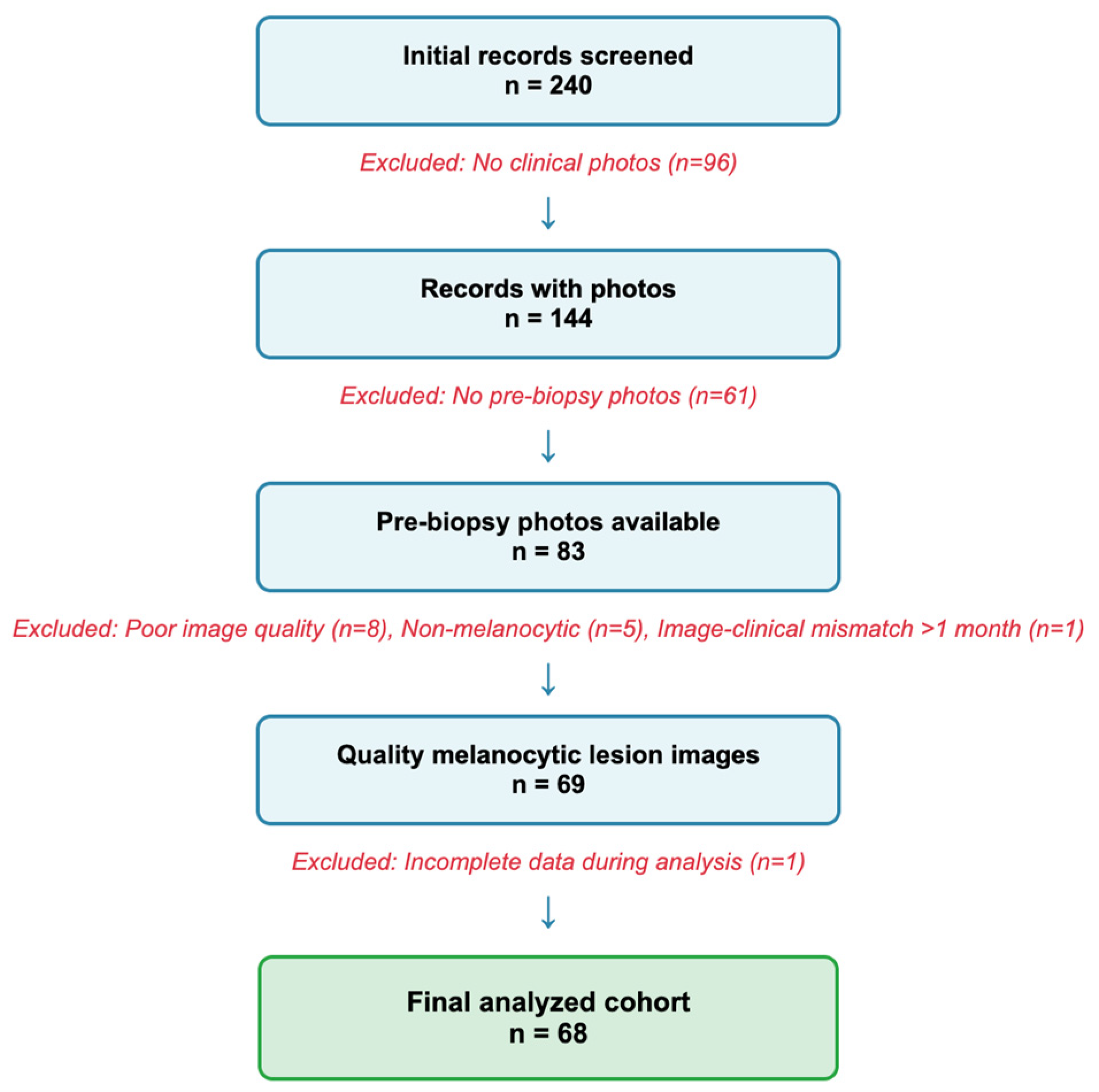 Images were included in the study if they: (1) were obtained from patients seen at Indiana University Health or affiliated clinics between February 2023 and May 2025 with pigmented skin lesions documented in the electronic medical record (EMR); (2) were taken prior to initial biopsy; (3) were associated with a clinician’s pre-biopsy diagnosis; and (4) had histopathological confirmation.