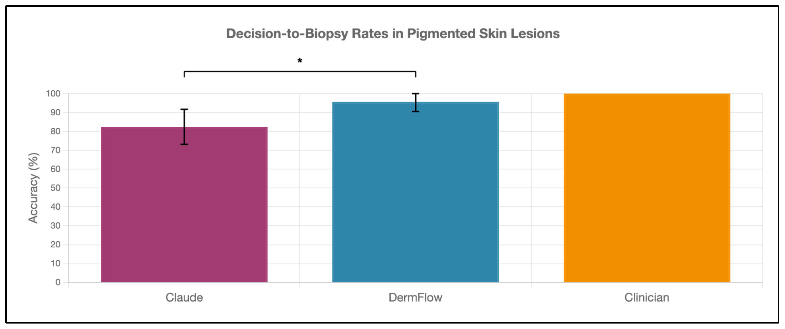 Figure 4. Decision-to-biopsy rates of Claude, DermFlow, and clinicians in pigmented skin lesions. Values shown as percentages with 95% confidence intervals. Statistical significance: * p < 0.05.