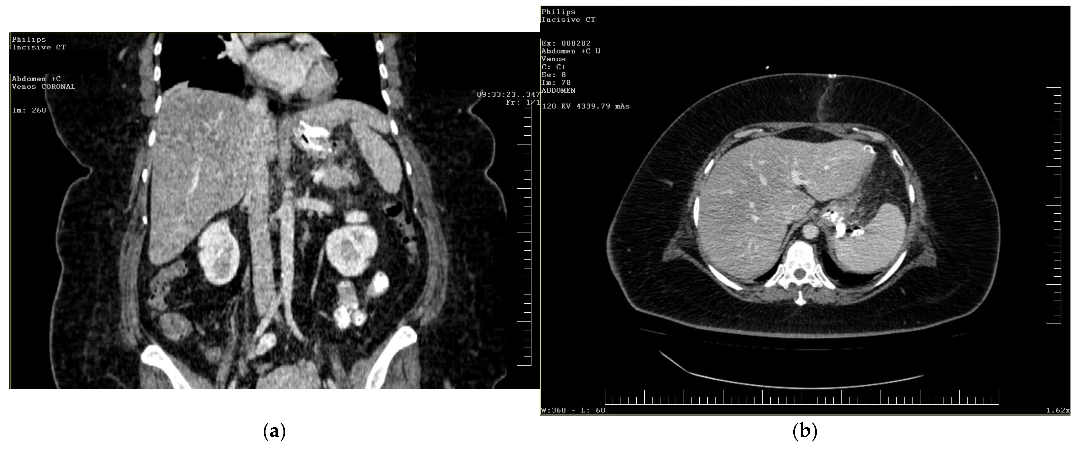 Figure 1a,b). In the gastric fornix, two parietal defects were observed, measuring 13 mm (on the posterior wall) and 3 mm (on the anterior wall), with the passage of orally administered contrast substance into the fat of the gastro-splenic ligament. Near the greater curvature of the stomach, a few gas bubbles were present in the omental fat. Further investigations were carried out, including an endoscopic examination, which revealed the esophagus with a 20 mm lumen and tertiary contractions. Additionally, a highly intense pneumatosis was observed throughout the entire colonic frame. The contrast agent administered during the procedure was later detected at the level of the left colon, further guiding the diagnostic process. Following this thorough clinical and paraclinical evaluation, the diagnosis of a high gastric fistula secondary to a gastric sleeve procedure was confirmed.
