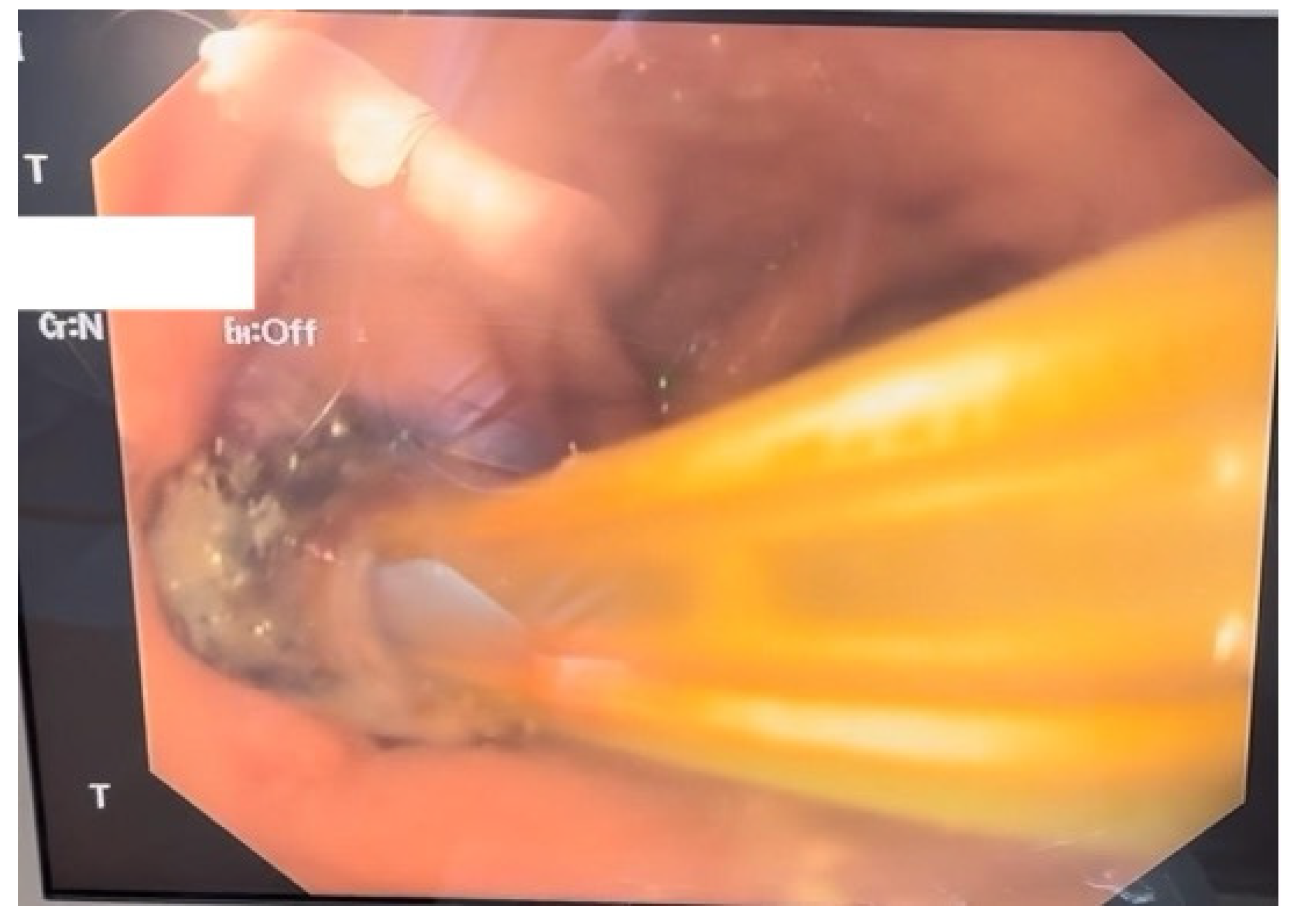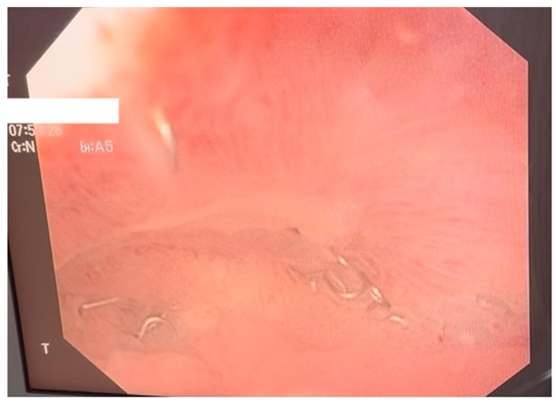 In the analyzed clinical cases, a sponge sleeve—through which a double-lumen suction tube was passed—was anchored at both the proximal and distal ends using 2/0 Vicryl sutures. This specific technique, developed through iterative clinical adjustments, significantly improved the mechanical stability of the assembly. The ends of the sponge were fixed to the aspiration tubing by suturing directly through the tubing wall, ensuring that the suction surface remained unobstructed. This approach not only prevented the sponge from migrating along the tube’s length, but also considerably reduced the risk of system rupture during removal. Furthermore, the anchoring method enhanced the endoscopist’s ability to control the device’s positioning at the site of the defect, an essential factor considering the limited space for maneuvering adjacent to the endoscope during insertion.