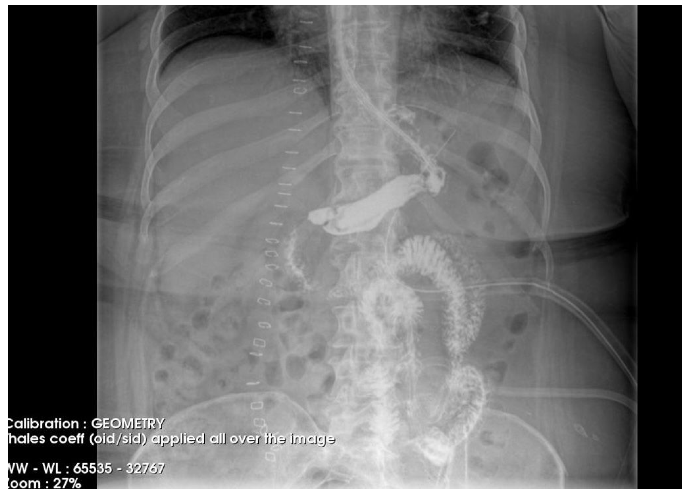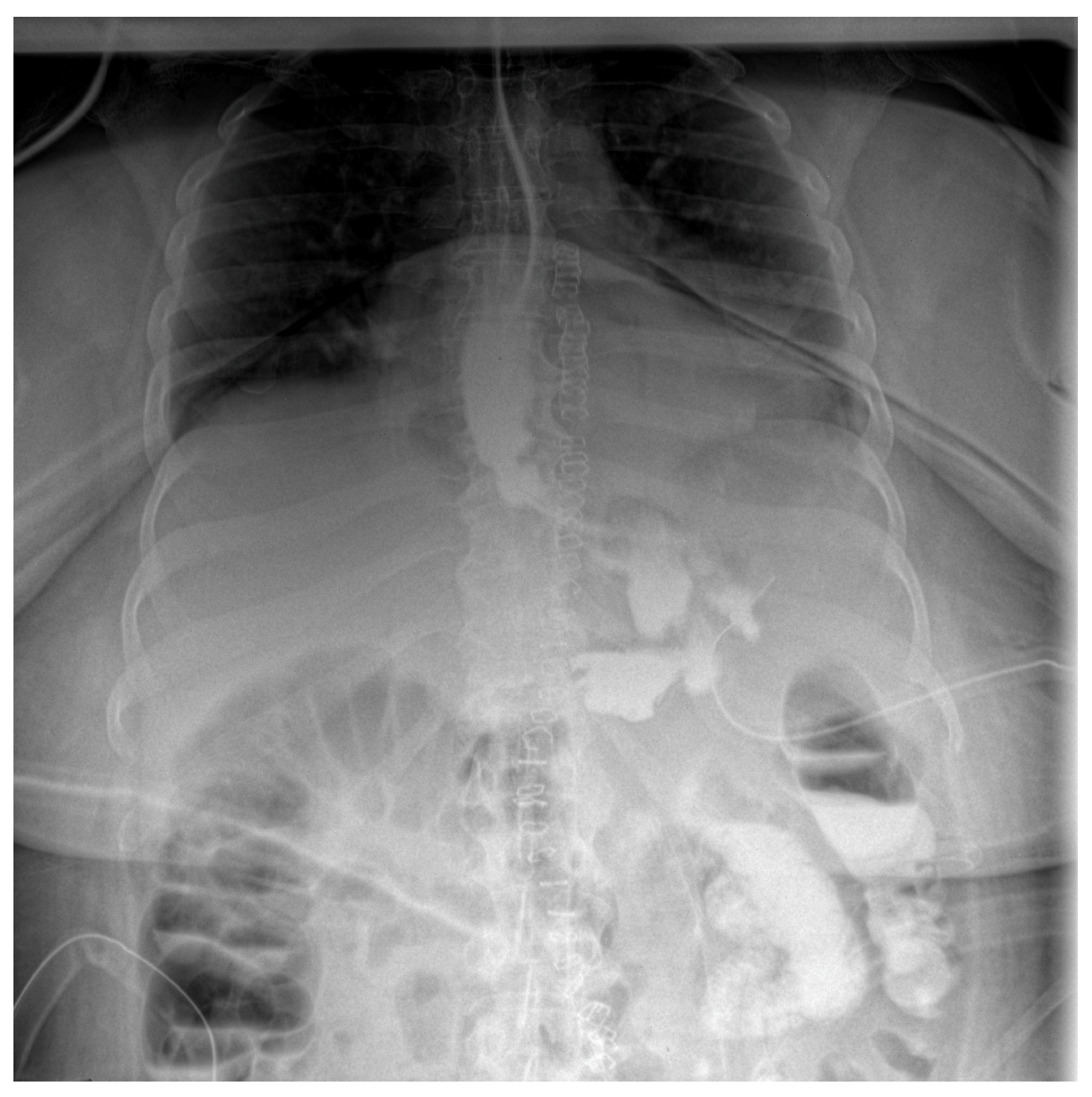 To gain a more comprehensive understanding of the patient’s condition, a contrast-enhanced abdominopelvic computer tomography (CT) scan was performed. Imaging revealed a reduced gastric volume with the nasogastric tube in place, previously positioned with its distal tip at the subcardial region (