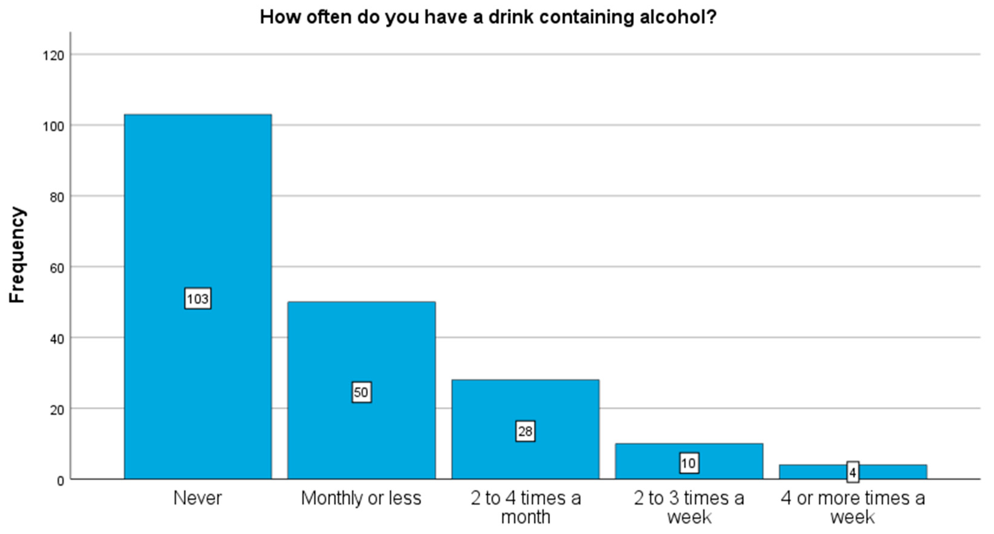 - Bush, K.; Kivlahan, D.R.; Mcdonell, M.B.; Fihn, S.D.; Bradley, K.A. The AUDIT Alcohol Consumption Questions (AUDIT-C): An Effective Brief Screening Test for Problem Drinking. Arch. Intern. Med. 1998, 158, 1789–1795. [Google Scholar] [CrossRef]