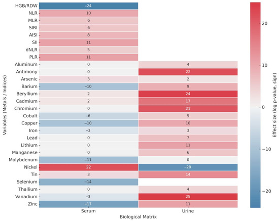 Heatmap showing differential serum and urinary metal concentrations and hematological inflammatory indices between PDAC patients and controls (Wilcoxon test).