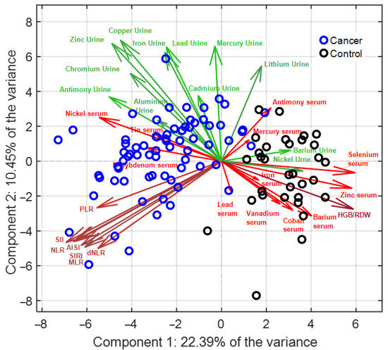 PCA Biplot: Scores related to cancer and control cohort are reported in blue and black, respectively. Loadings related to metal content within urines are reported in green, whereas those pertaining to serum are in red. Finally, inflammatory markers are highlighted in brown. Uninformative loading values were removed to avoid the plot weighting.