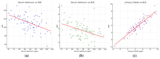 Scatterplots of correlations between trace elements and inflammatory indices in PDAC. (a) Serum selenium vs. SIRI, (b) serum selenium vs. NLR, and (c) urinary cobalt vs. NLR. Red dashed lines indicate regression fits.