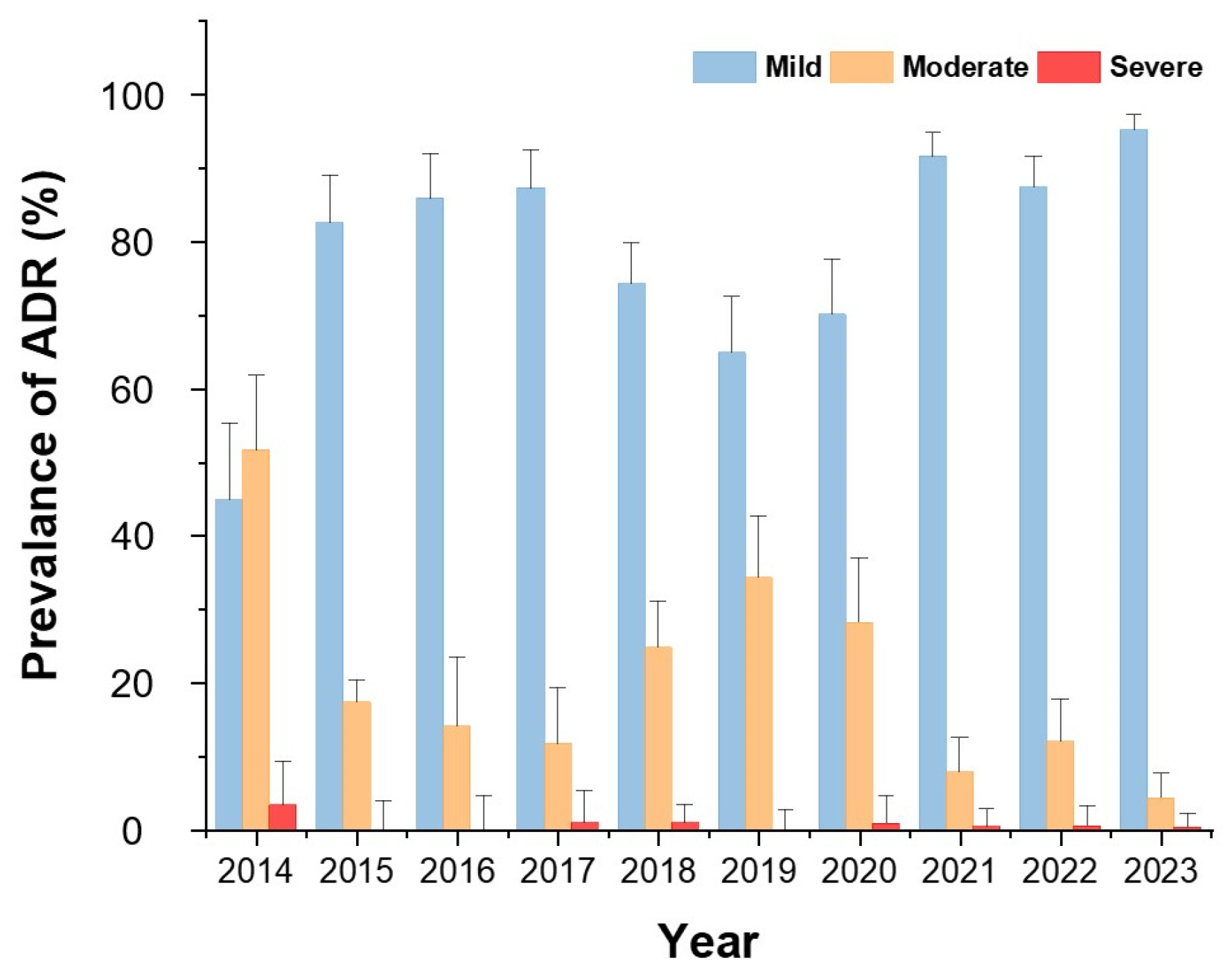 Figure 2 demonstrates that mild reactions accounted for the majority of ADRs across all years except 2014. The proportion of severe ADRs remained low throughout the study period.