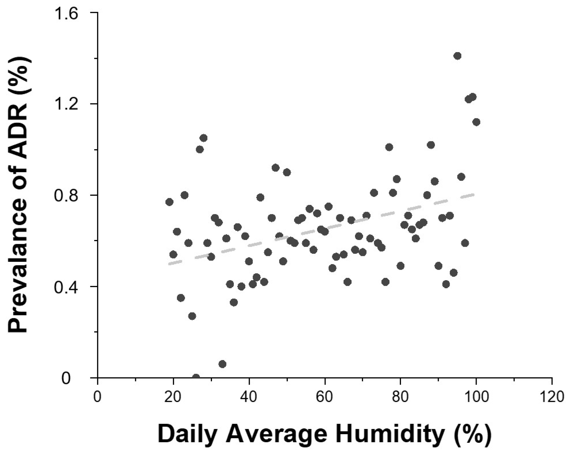 Figure 4). As the temperature increased, so did the prevalence of ADRs. Higher average humidity levels were also associated with increased ADR risk (
