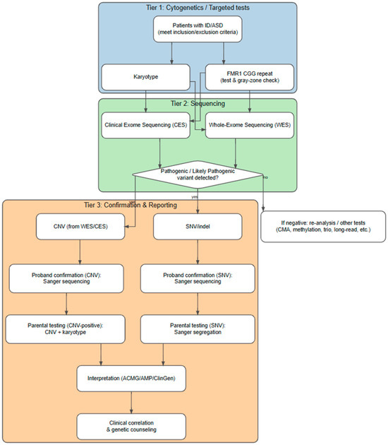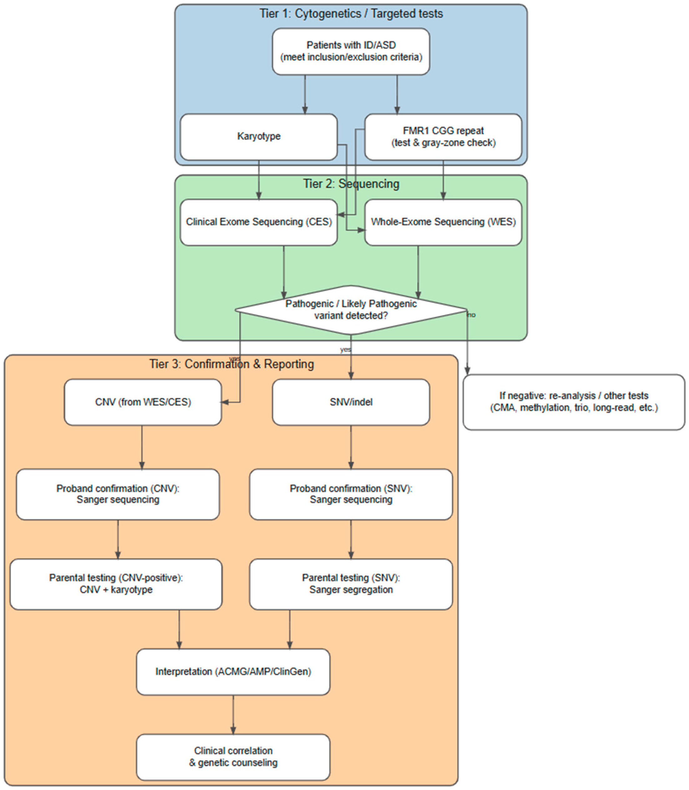 This study adopted a stepwise diagnostic strategy to maximize the detection of underlying genetic etiologies in patients presenting with ID and/or ASD. The workflow integrated cytogenetic, sequencing, and confirmatory approaches to ensure comprehensive genomic characterization and accurate clinical interpretation (