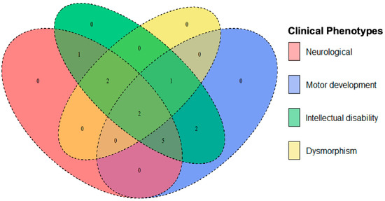 Visual tools, such as Venn diagrams, proved valuable for integrating genetic and phenotypic data, enabling clear visualization of overlapping domains, including intellectual disability, motor deficits, and dysmorphism. Expanding this framework to incorporate additional clinical subcategories—such as severity of ID or epilepsy subtypes—could further enhance diagnostic precision and support personalized management strategies.