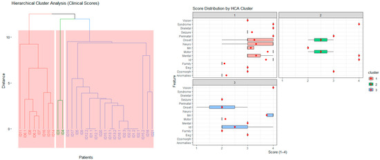 Distinct clinical patterns emerged among the three HCA clusters. Cluster 1 (red) exhibited elevated scores across multiple domains (e.g., onset, neurological, cognitive, MRI, and seizure), reflecting early-onset, severe multisystem disease. Cluster 2 (green) displayed intermediate severity, particularly in neurodevelopmental and cognitive domains, representing moderate phenotypes. Cluster 3 (blue) showed relatively milder and more localized abnormalities, often dominated by motor and perinatal features. These distributions demonstrate that HCA effectively stratified patients into biologically meaningful subgroups with differing phenotypic severity profiles (