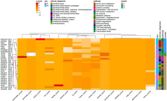 j. This transformation ensured comparability across heterogeneous clinical scales by rescaling all domains to a mean of 0 and SD of 1. The normalized matrix was subjected to hierarchical cluster analysis (HCA) using Euclidean distance and complete linkage to identify latent groupings of patients sharing similar clinical patterns. Heatmap visualization integrated HCA-derived structure with gene-level and biological pathway annotations (e.g., ion channel regulation, transcriptional control, myelination, and metabolic signaling) to highlight phenotypic convergence and mechanistic differentiation across gene groups.