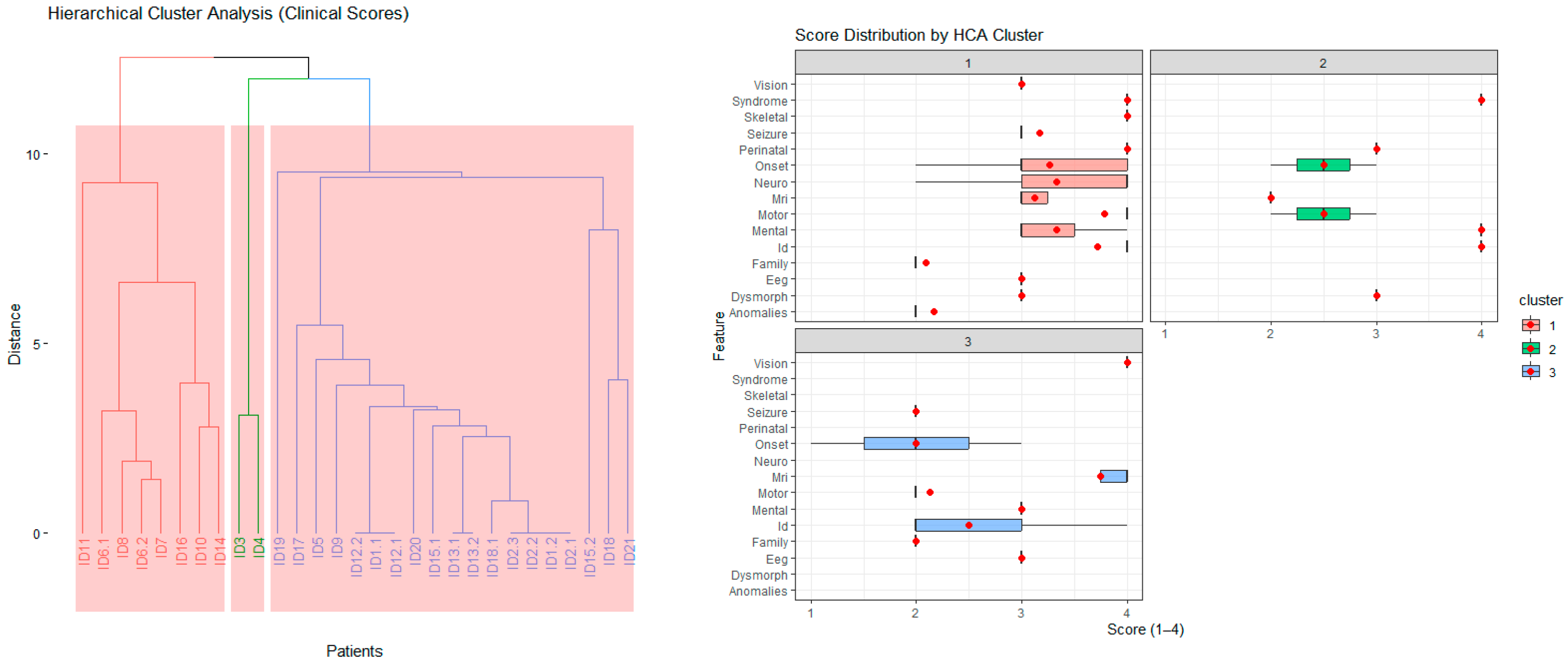 18] and hierarchical clustering analysis (HCA). By converting qualitative clinical observations into standardized quantitative matrices, multidimensional analysis enables systematic mapping of genotype–phenotype correlation and identification of phenotypic clusters reflecting shared molecular pathway. Such data-driven integration improves the power of genomic findings, facilitates patient stratification for functional studies and supports potential precision medicine applications [