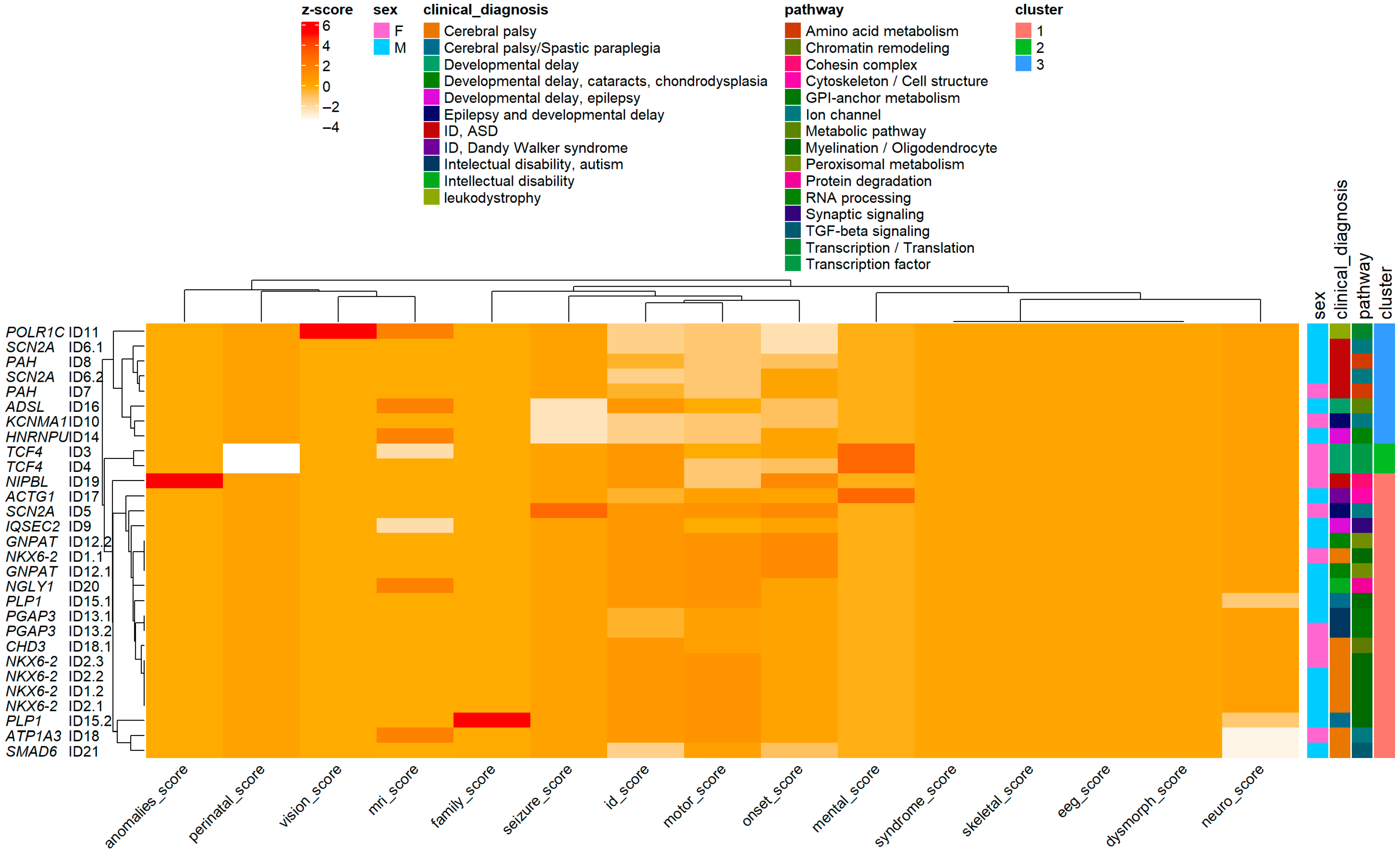 Given the absence of demographic bias, further multidimensional analyses were performed to investigate genotype–phenotype relationships and pathway-level clustering. Using the semi-quantitative clinical scoring system, numerical scores were assigned to major phenotypic domains for each patient carrying monogenic variants (