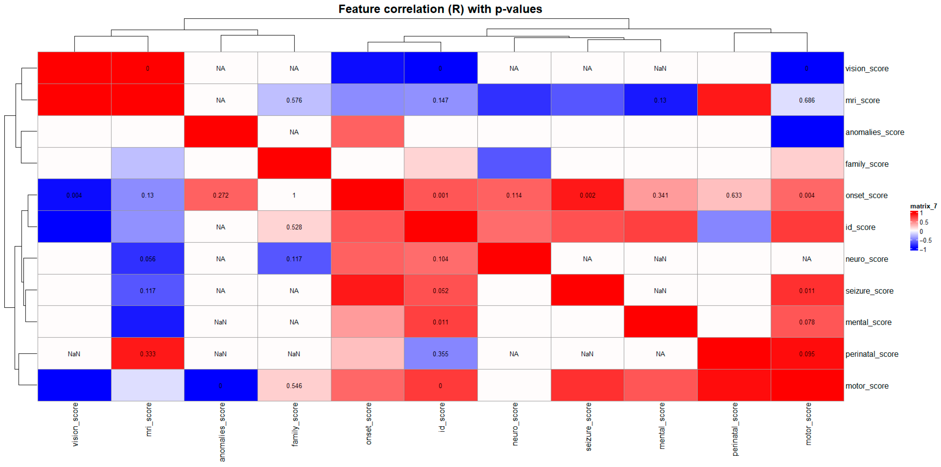 Pairwise relationships among clinical domains were quantified using Pearson’s correlation coefficients (R) with corresponding p-values, visualized in a color-coded correlation heatmap. This matrix-based representation provided insight into interdependent phenotypic features and potential syndromic clusters within the cohort.