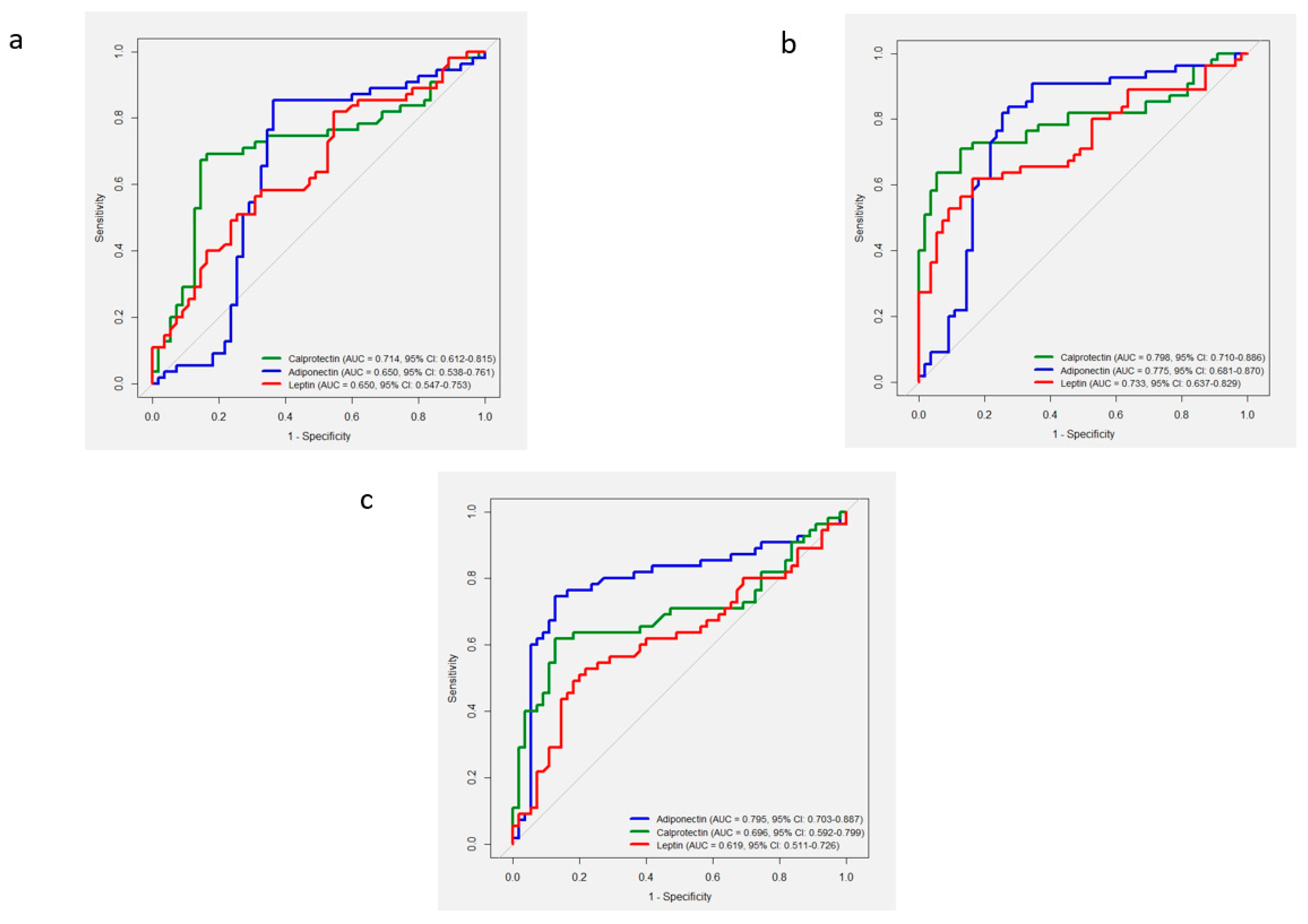 | Adiponectin | ≤14.04 | 0.795 [0.703–0.887] | 0.745 [0.610–0.853] | 0.873 [0.755–0.947] | <0.001 |