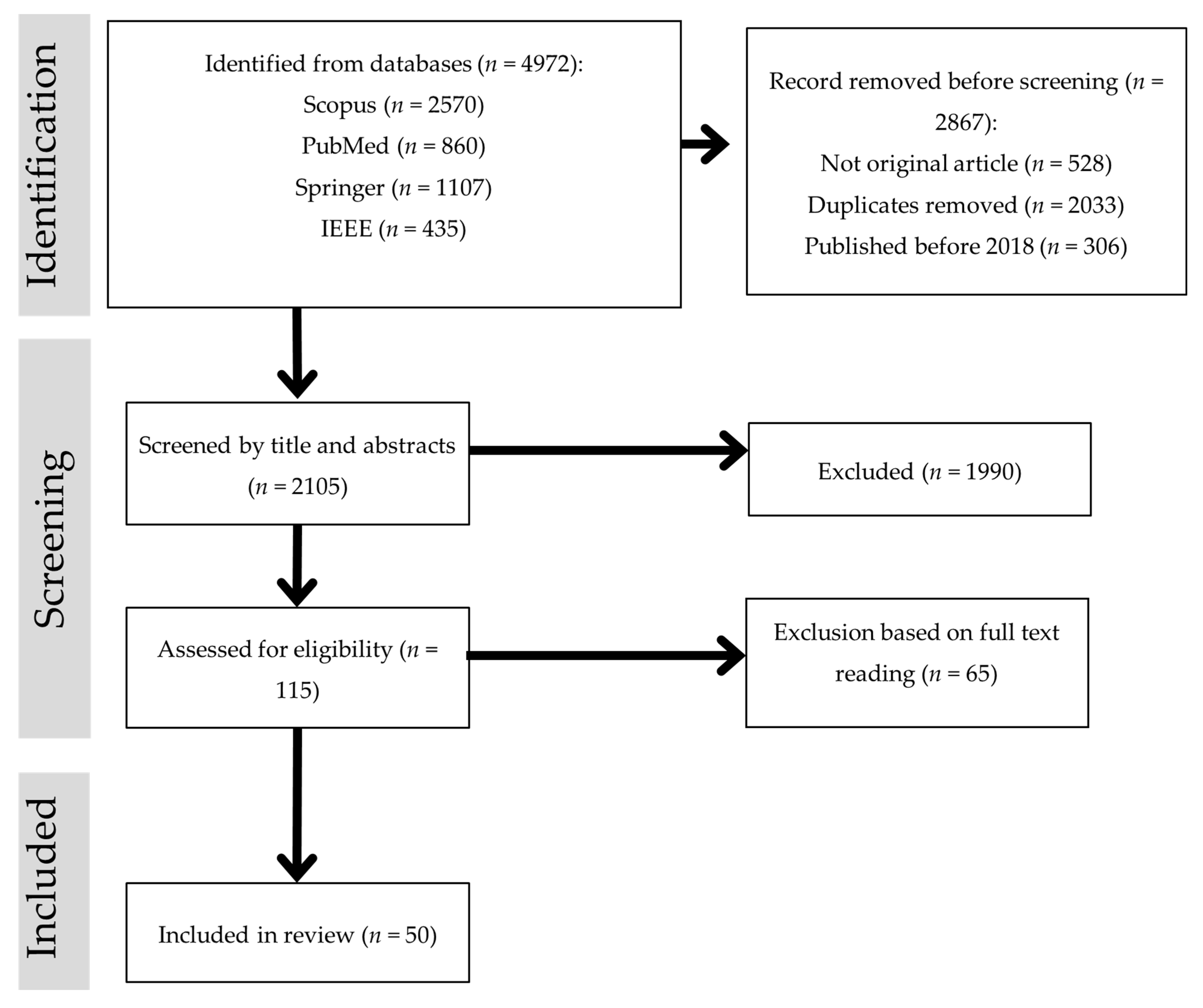 - Identification: A comprehensive search was conducted in four major databases—Scopus, PubMed, SpringerLink, and IEEE Xplore—to identify studies on mammogram-based computer-aided detection (CAD). The search covered publications from 2018 to 2025 using keywords such as “CAD for mammogram”, “mammogram classification”, “deep learning mammogram”, “machine learning mammogram”, and “hybrid/ensemble mammogram”. A total of 4972 records were retrieved (Scopus = 2570; PubMed = 860; SpringerLink = 1107; IEEE Xplore = 435). Before screening, 2867 records were removed, including 528 non-original articles (e.g., reviews, editorials), 2033 duplicates, and 306 studies published before 2018.