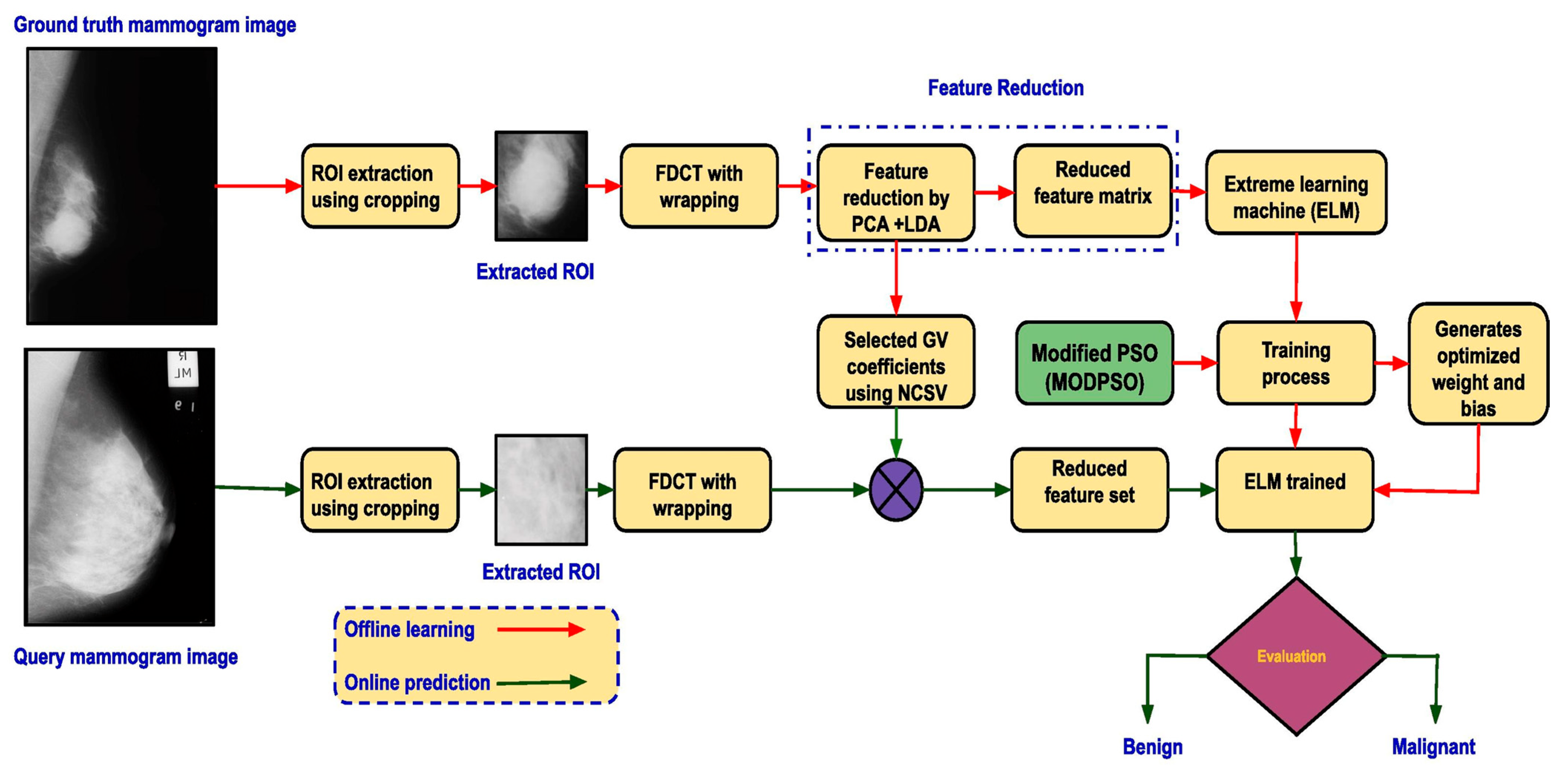 | Machine learning [21] | MIAS, DDSM, INbreast | X | Fast discrete curvelet transform (FDCT-WRP) | Principal Component Analysis (PCA) and Linear Discriminant Analysis (LDA) | Modified Particle Swarm Optimization | Extreme Learning Machine (ELM) | 100% (benign and malignant class) |