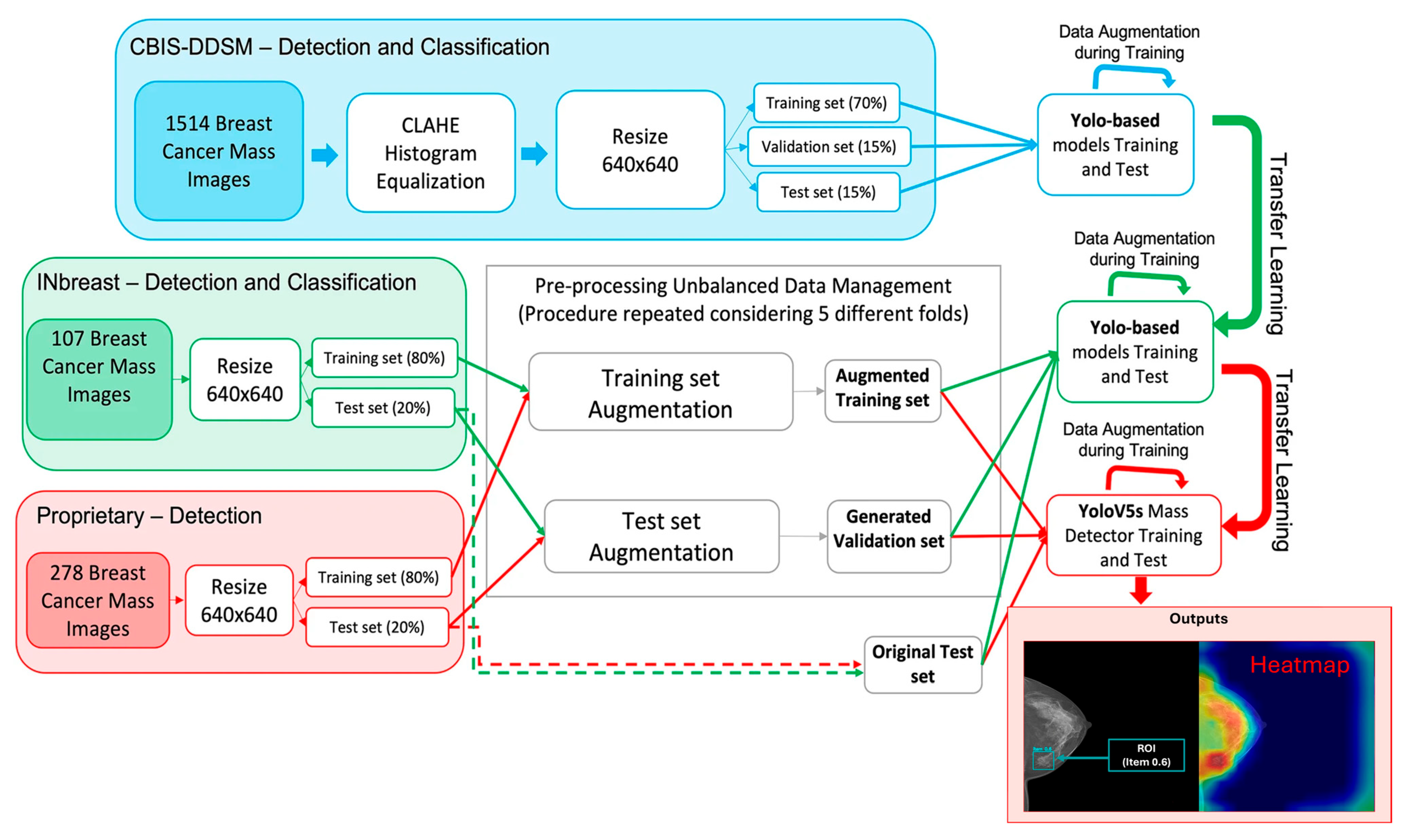 | 23 | [50] | CBIS-DDSM, INbreast, and private dataset collected from University Hospital “Paolo Giaccone,” Palermo, Italy | Yolo-based model | Yolo model | Yolo-based model | Benign and malignant: CBIS-DDSM dataset: mAP (mean Average Precision) of 0.498. INbreast dataset: mAP of 0.835 | The proprietary dataset is heavily imbalanced, with 82.4% of the lesions being malignant, which may affect the model’s ability to generalize well |
