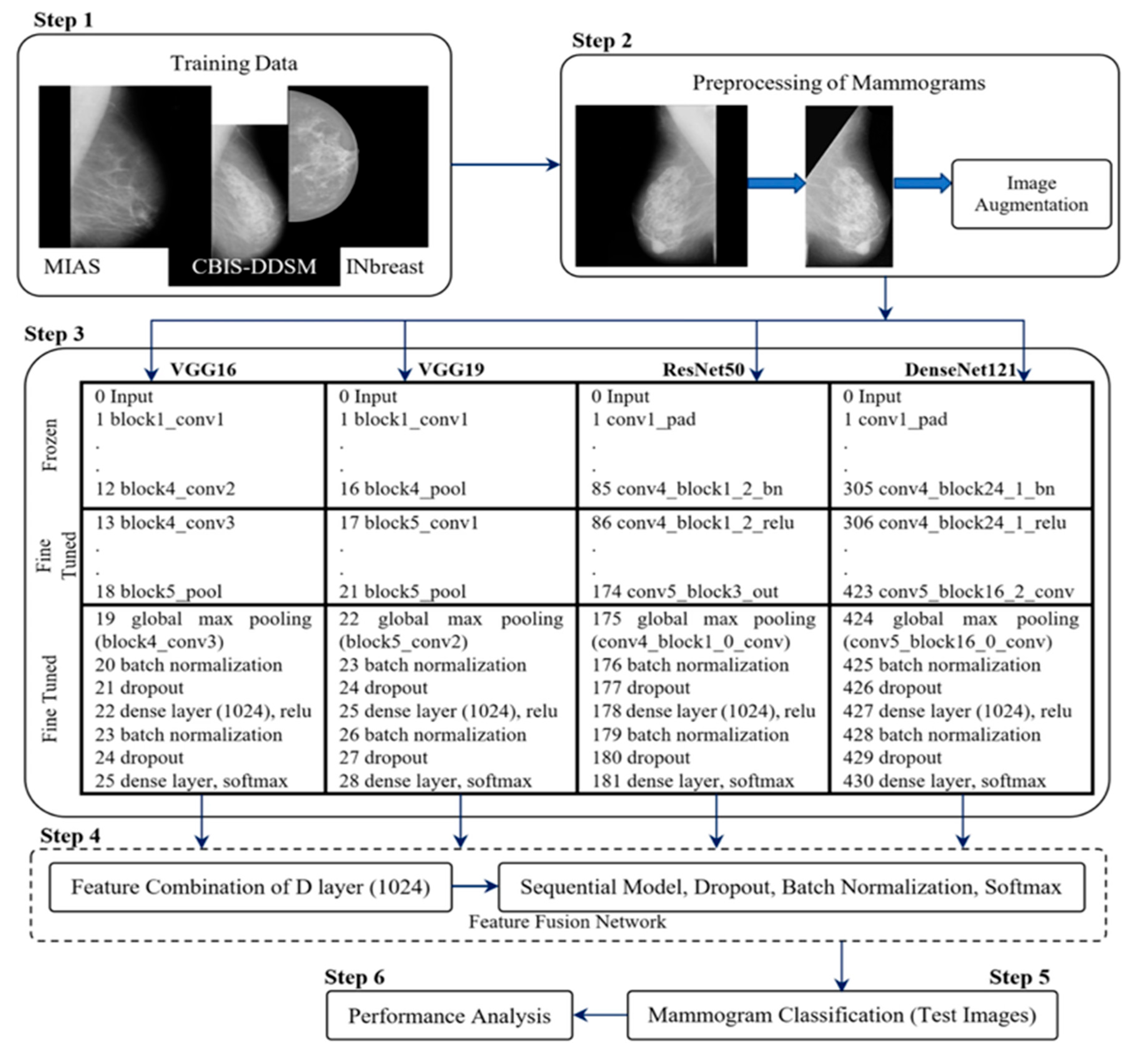 | 6 | [57] | MIAS, INbreast, CBIS-DDSM Dataset | Not applicable | CNN architecture: VGG16, VGG19, ResNet50, and DenseNet121 | CNN hybrid approach: VGG16, VGG19, ResNet50, DenseNet121. | Normal, Benign, and malignant categories: MIAS’s accuracy: 98.70% Inbreast’s accuracy: 98.83%. | Computational complexity due to the combination of multiple CNN models. Additionally, there were slight challenges in discriminating against malignant cases compared to normal and benign cases. |