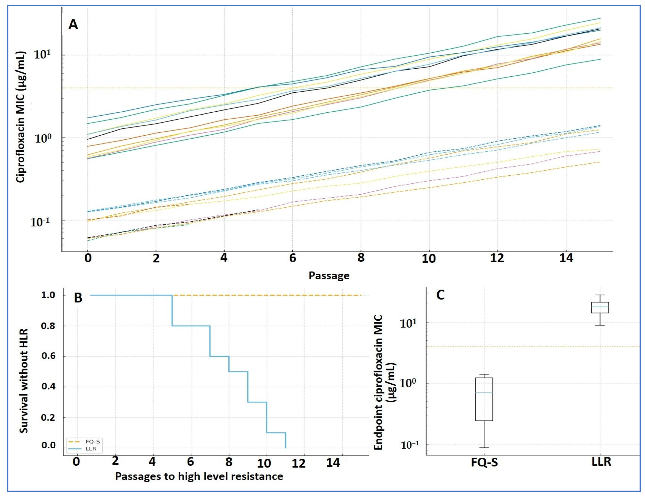 3.4. Evolution Under Ciprofloxacin: Trajectories and Time to High-Level Resistance