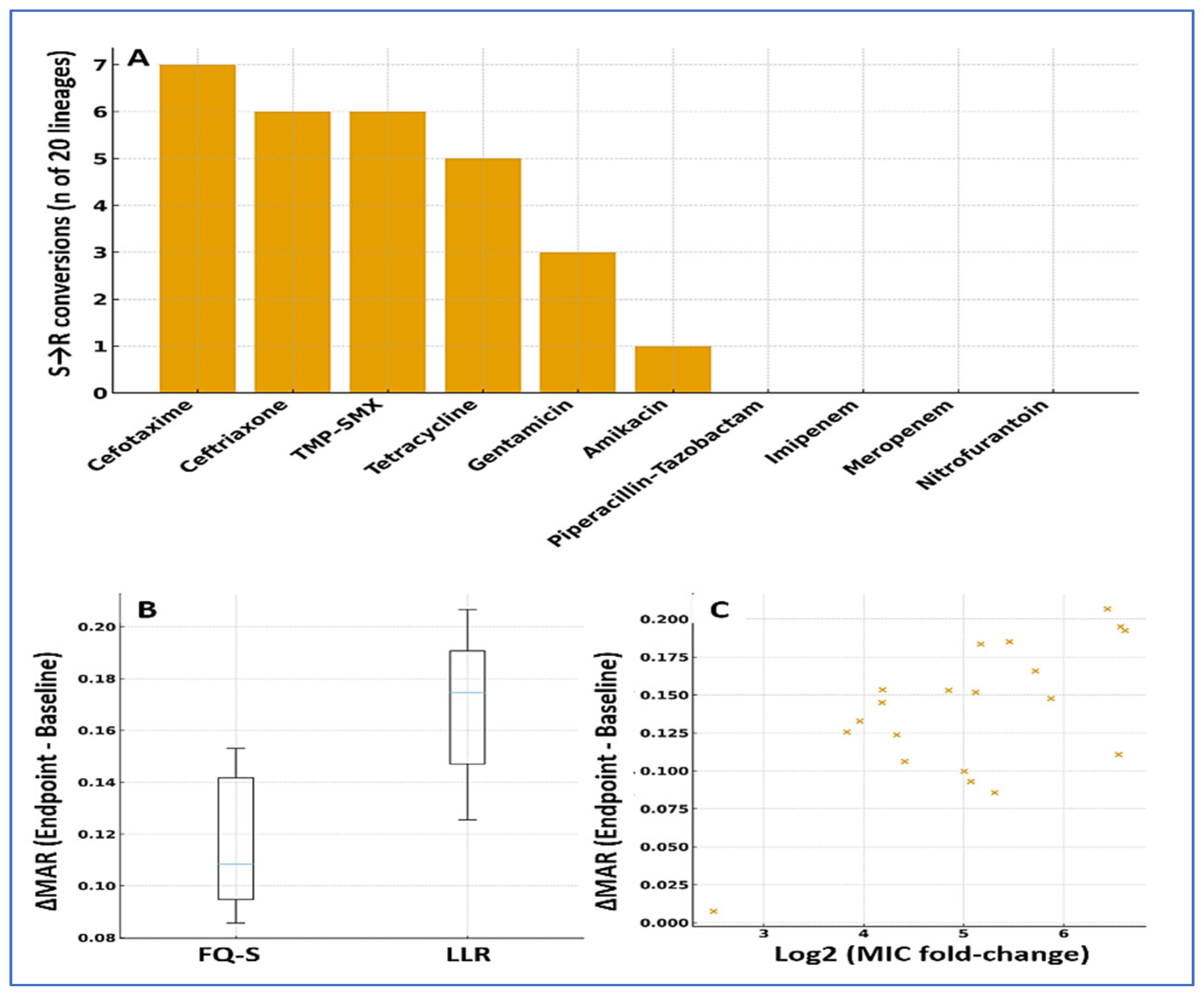 3.2. Baseline Susceptibility, ESBL/AmpC, MDR, and MAR (Arm 1)