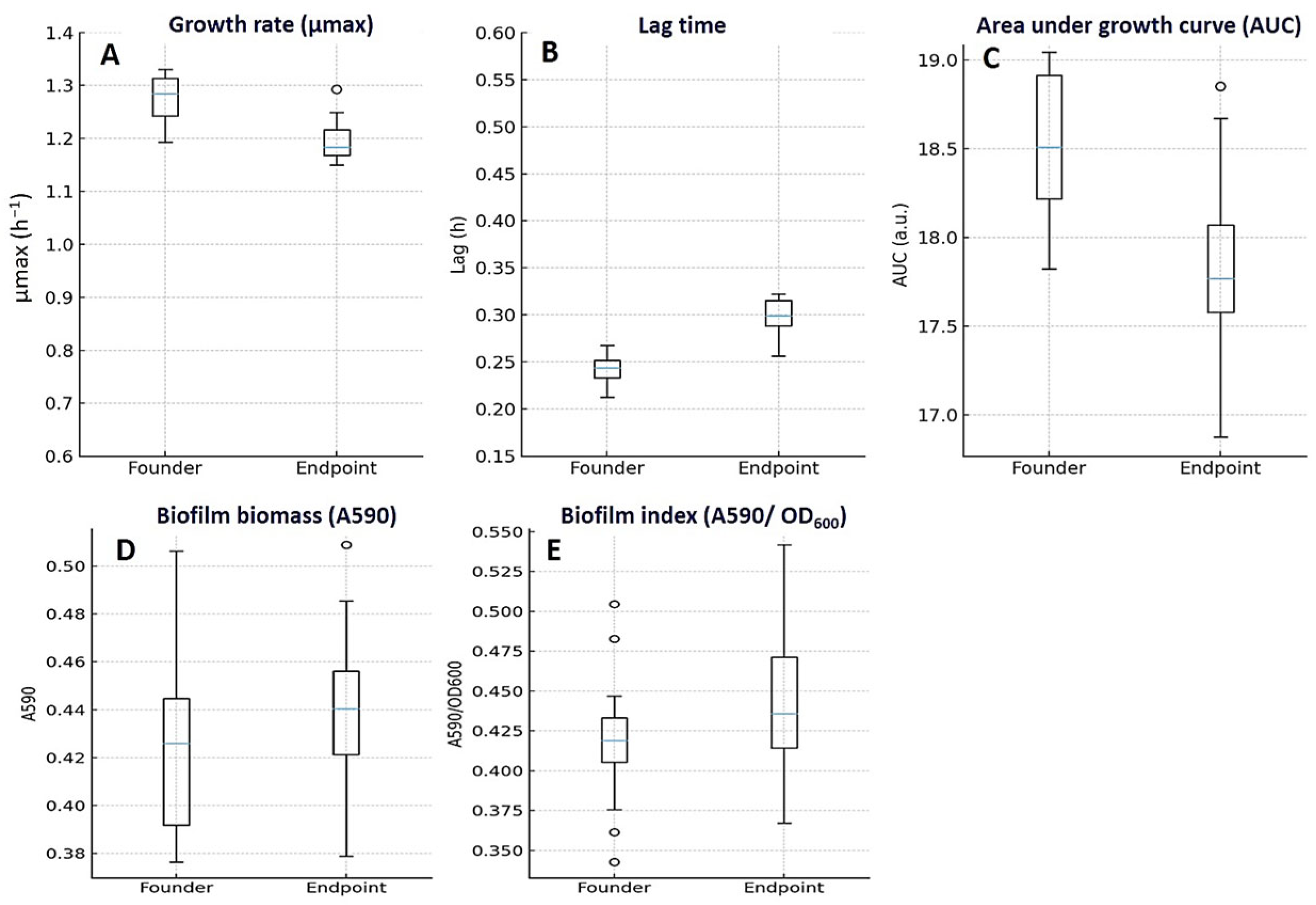 3.6. Growth Fitness and Biofilm Metrics