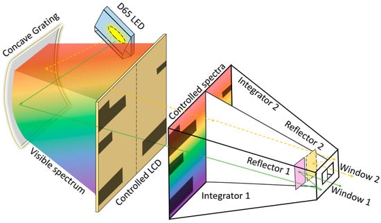 Schematic of the full-color light generation system, which consists of two collimated 25 W D65 LED light sources emitting through a slit and passing through a concave grating to generate two visible spectra when illuminating the two LCD-controlled areas. The spectra are uniformly mixed by Integrators 1 and 2. The mixed lights, reflected by Reflectors 1 and 2, are emitted from Windows 1 and 2, respectively.