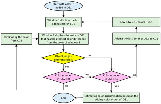 Figure 2 presents the flowchart of the proposed CFCA procedure. Initially, the pilot color P of the D-15 test is displayed in Window 1. The color shown in Window 1 constitutes color group 1 (CG1), while the remaining 15 colors form color group 2 (CG2). The color in CG2 with the greatest difference from the color in Window 1 is then displayed in Window 2. When the subject judges the two colors as different by pressing a key of the computer keyboard, that color is eliminated from CG2, and the next color with the maximum difference is displayed in Window 2. The comparison with Window 1 is complete when no colors remain in CG2 or when the subject judges the two colors as identical. At this point, the last color in CG2 is added to CG1 and displayed in Window 1. The remaining colors, excluding those in CG1, form the new CG2, and the process is repeated. This iterative comparison continues, with colors in both windows being replaced, until no new color can be added to CG1, i.e., when CG1 = 16 and CG2 = 0. Finally, the CFCA process estimates color discrimination according to the order in which colors are added to CG1. The final CFCA result is then compared with the classical D-15 method.