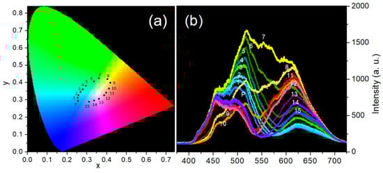(a) CIE chromaticity diagram showing the 16 color discs labeled by P and 1–15; (b) Reflective spectra of the 16 color discs labeled by P and 1–15 irradiated by a D65 light.