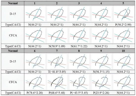 Figure 5 shows the results of the D-15 and CFCA tests in 11 patients with CVDs. Except for Subject 2 in the D-15 test, all patients exhibited crossed lines, confirming the presence of CVD. Notably, Subject 2 failed the Ishihara test but passed the D-15 test. This outcome is consistent with the fact that the D-15 test passes 35–50% of deuteranomalous trichromats and over 40% of protanomalous trichromats [26,27]. This subject was identified as the deutan type in the CFCA test. In the D-15 test, the CI values ranged from 1 to 4.54, comprising three protans, seven deutans, and one normal subject. In the CFCA test, the CI values ranged from 1.38 to 4.11, with the dataset consisting of eight protans and three deutans. These values are listed in Table 2, together with the calculated mean ± SD and interquartile range (IQR) values. As indicated, the mean CI values for the D-15 and CFCA methods are 2.81 and 2.91, respectively. When two patients (Patients 4 and 10), who exhibited clear experimental deviations, were excluded due to large discrepancies between CI values in the D-15 (3.44 and 1.38) and CFCA (1.63 and 3.66) tests, the mean CI values for the two methods are closer, being 2.91 and 2.96, respectively. These discrepancies are more than 20 times greater than the difference between the mean CI values of the two methods (approximately 0.1, as shown in Table 2) and could serve as a criterion for statistical exclusion.